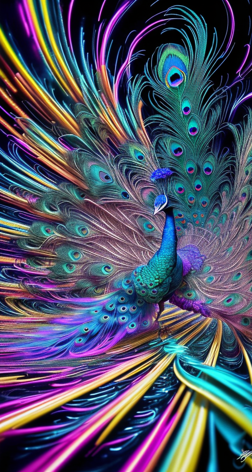masterpiece, highres, (a peacock:1.1), fractal, hdr, (intricate details, hyperdetailed:1.3), cinematic shot, vignette, light painting, (long exposure:1.3),dynamic streaks, luminous trails, vibrant colors, fluid movement, captivating patterns, creative experimentation, spread wings, spread tails, fractal wings, fractal tails, fractal body, (long exposure:1.3), chromatic aberration