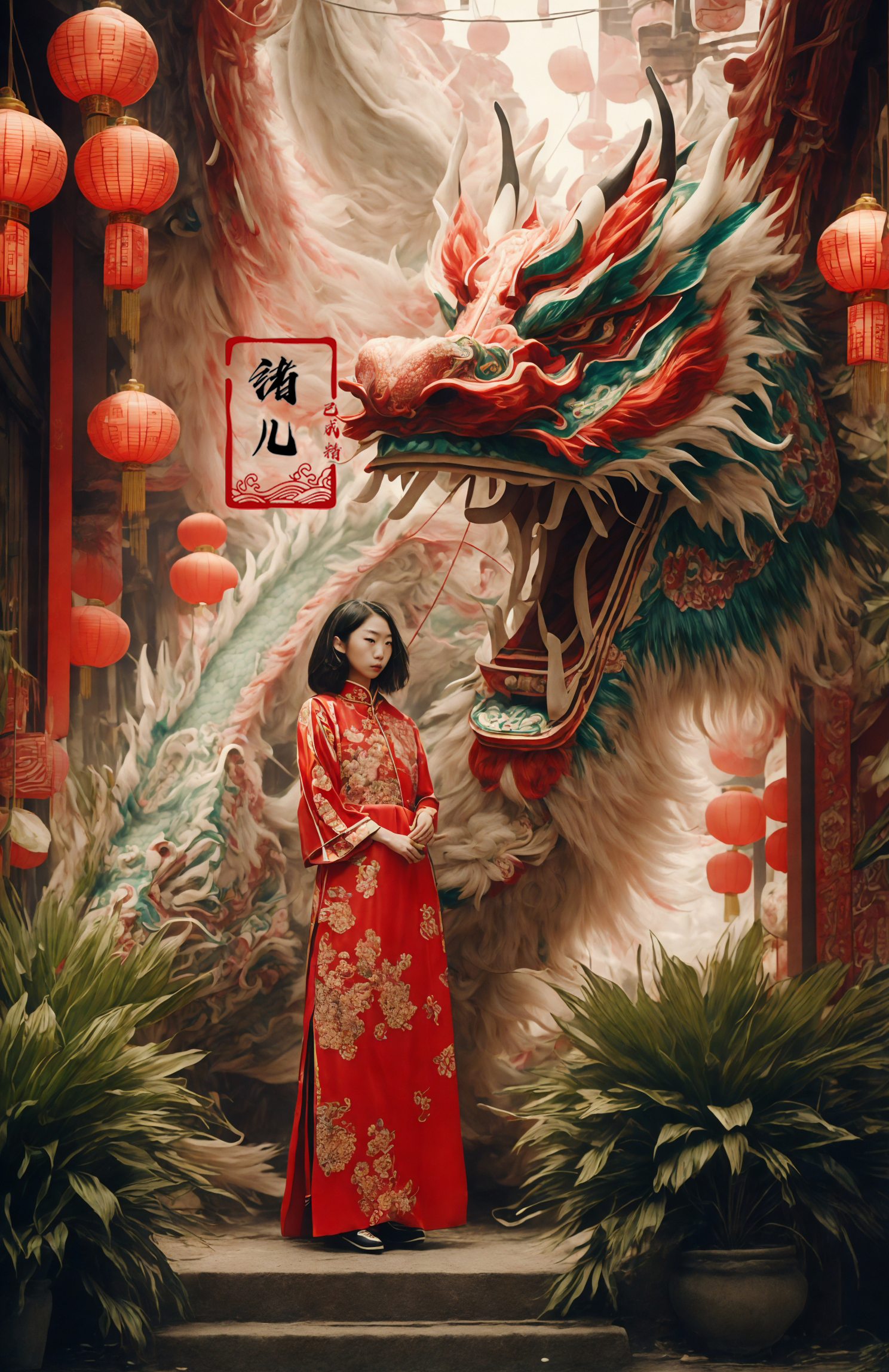 (dramatic, gritty, intense:1.4),masterpiece, best quality, 32k uhd, insane details, intricate details, hyperdetailed, hyper quality, high detail, ultra detailed, Masterpiece, Red China theme Lunar New Year celebrations with vibrant dragon dances with a wonderful plants touch, captured in the evocative style of Albert Watson.. Featuring: Fujifilm Neopan 100 , fullbody shot , Fujicolor Fujichrome Velvia 100 , UHD , Award-winning , clean background Water, courtyard, plants, flowers, Chinese dragon1girl, Chinese cheongsam, <lora:~Q?-Dragon dance:0.9>