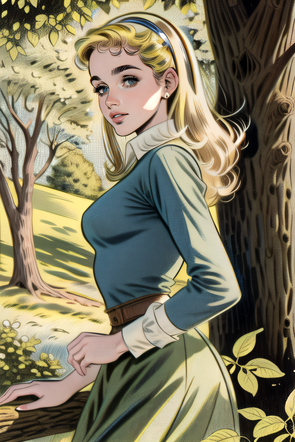 Masterpiece, best quality, hi res, 8k, hi res, 8k, award winning , (sharp focus, intricate, highly detailed) <lora:romancecomics03:1> romancecomics, drawing of a woman in nature, vintage color comics