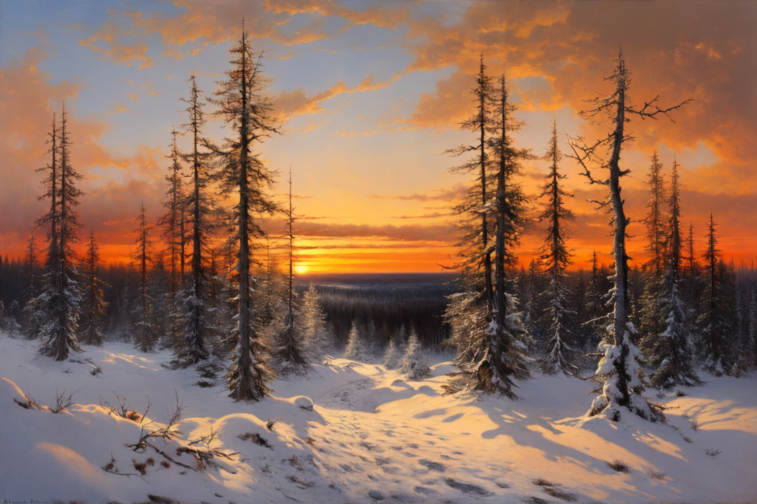 albert_bierstadt, a painting of a birch forest in the (winter,orange/pink sunset), distant sun, landscape <lora:Albert_Bierstadt:1>