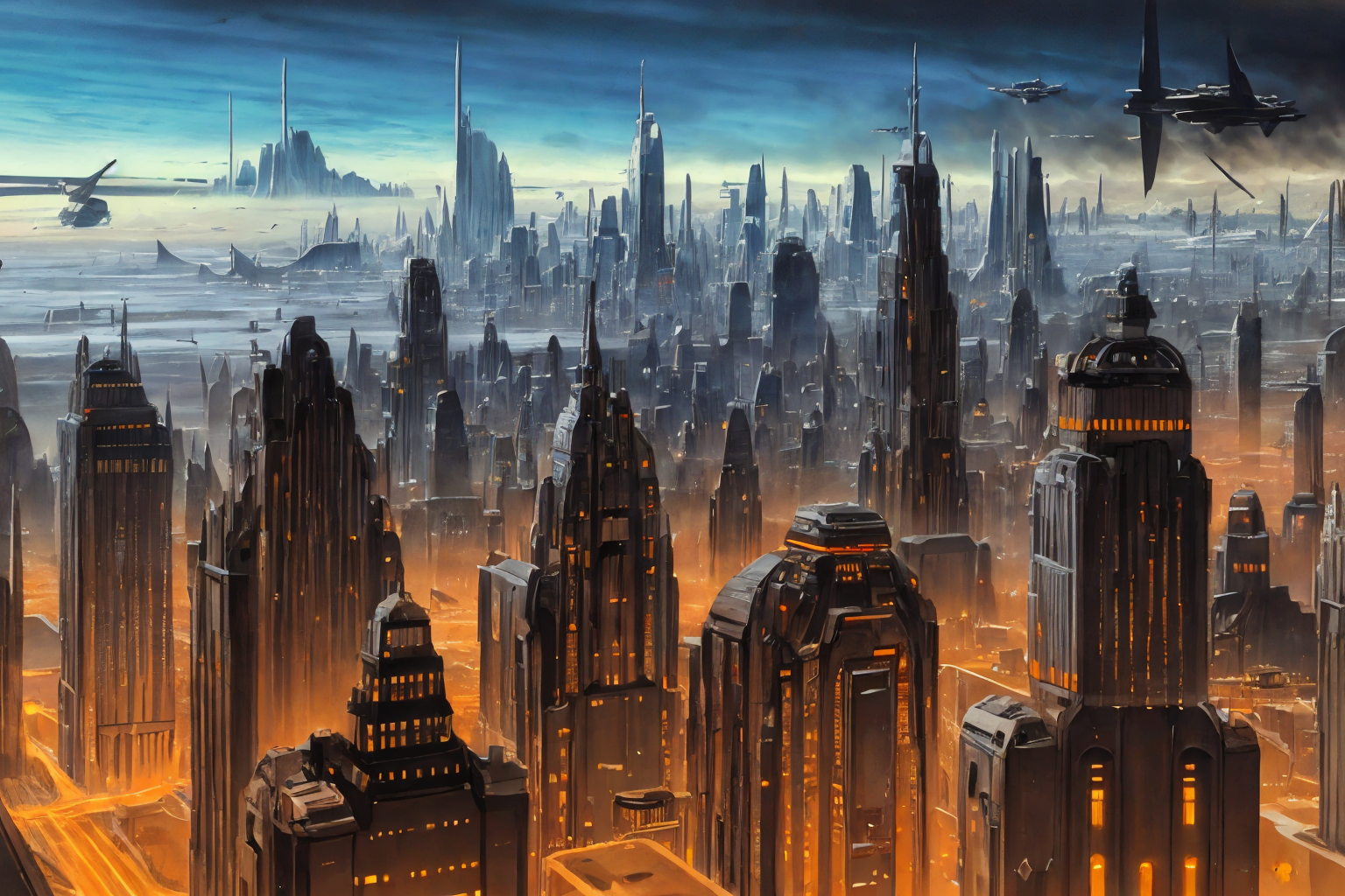 a futuristic city with a lot of tall buildings and a plane flying over it in the sky above the city, matte painting concept art, a detailed matte painting, retrofuturism <lora:Ralph_Mcquarrie_style:1>