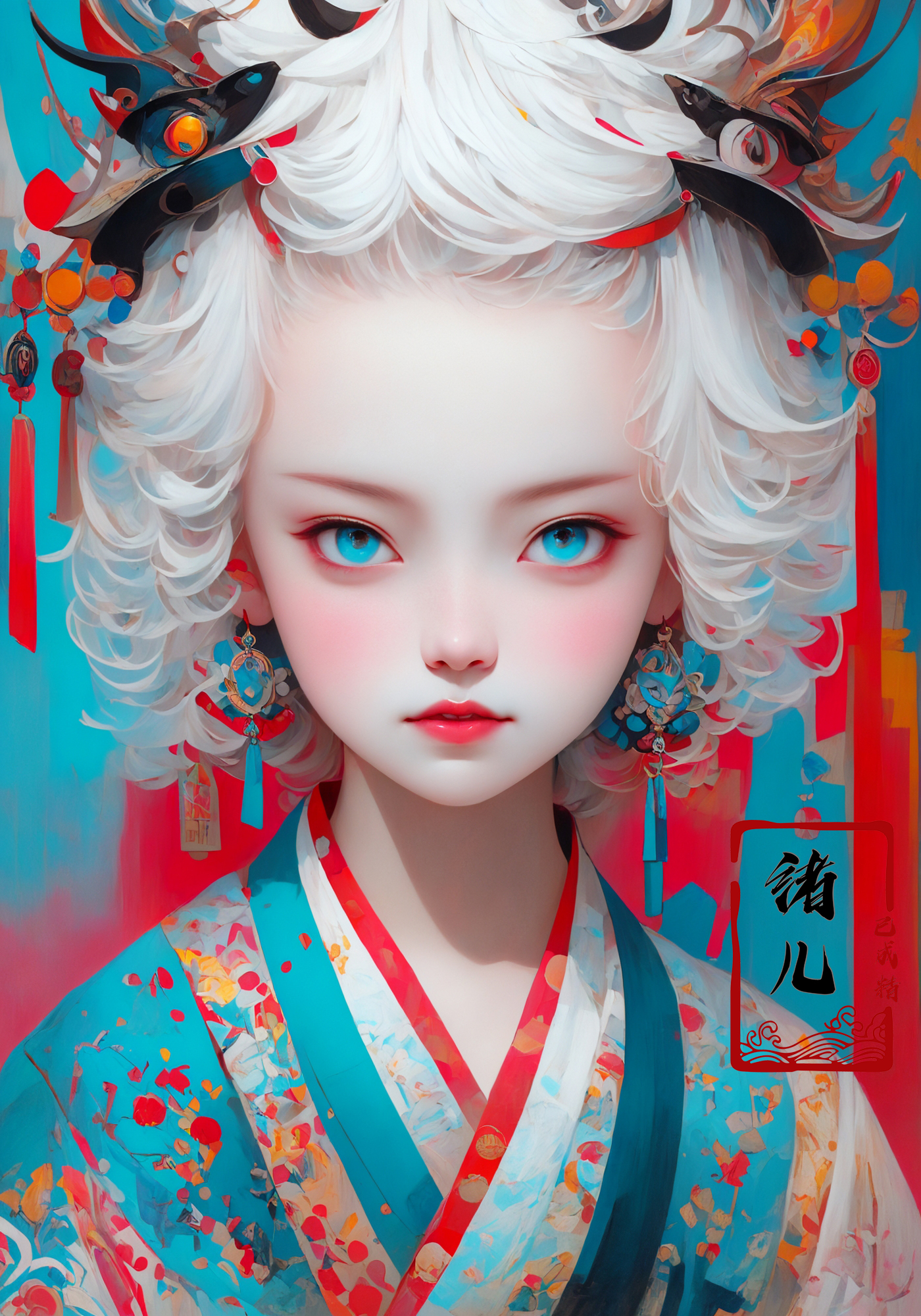 32K, Surreal, best quality, masterpiece, highres, original, extremely detailed wallpaper, perfect lighting, UHD, white hair,Zhang Jingna,in the style of aggressive digital illustration, bold and colorful portraits, lit kid, Picasso,Hikari Shimoda(full body:1.2), (East Asian architecture:1.3) (Blue road robe1.3) <lora:~Q?-YG^{Zwith horns:0.8>