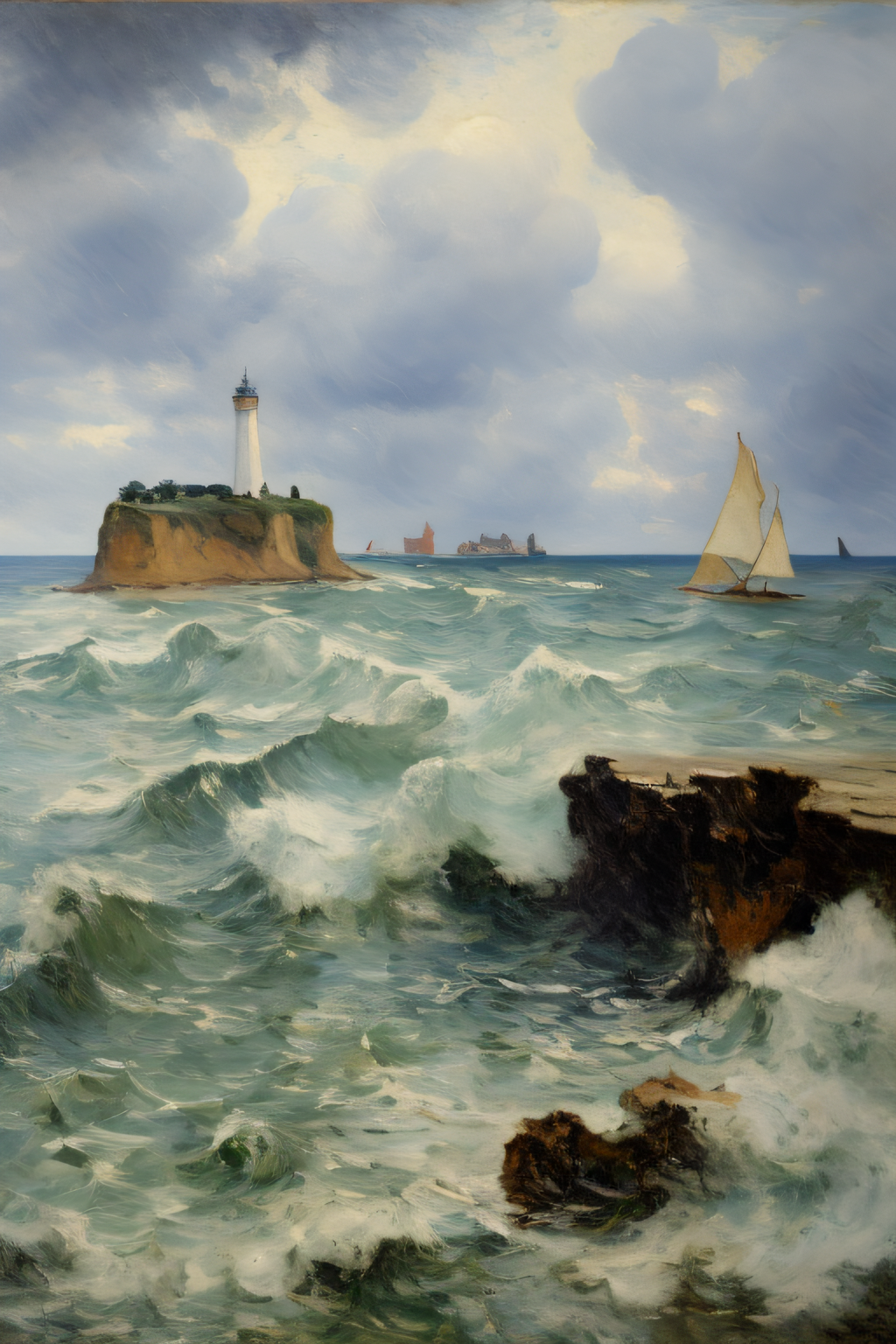 claude_monet, a painting of a ocean cliffside with distant lighthouse, stormy clouds, rain, stormy waves, landscape <lora:Claude_Monet:1>