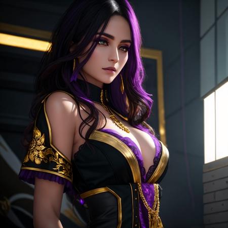 change clothing to black, purple, and gold, gold earring, ear showing, fire casting light in the background, extremely detailed, high quality, beautiful, detailed face, Best quality, masterpiece, ultra high res, (photorealistic:1.4), raw photo, detailed skin,