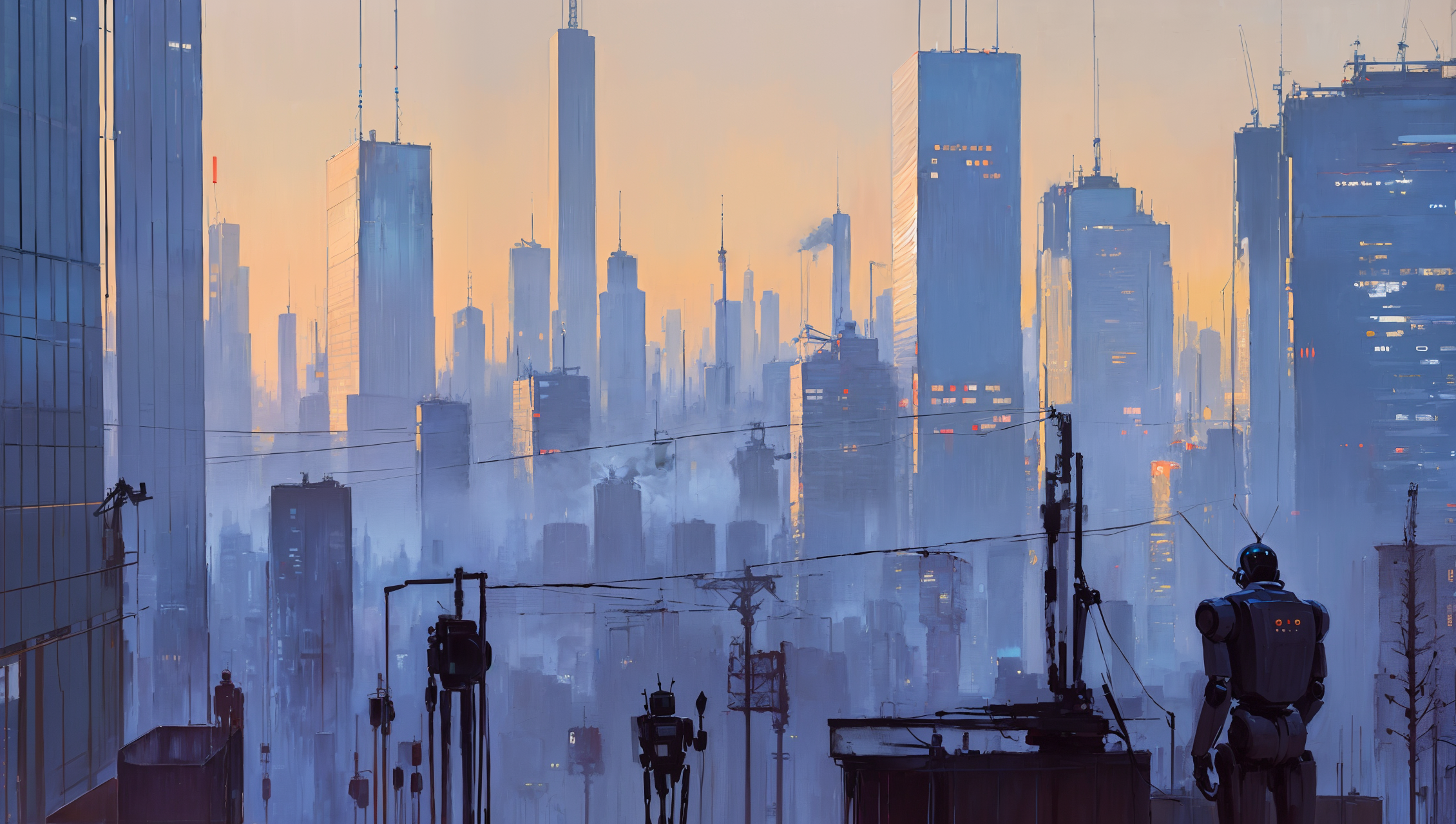 (abstract expressionist oil painting brushstrokes:1.2), a (robot worker:1.2) looking out over a (futuristic cyberpunk:1.1) city during construction, soft evening light, (neon), smoke and haze, (crane smokestack:0.7), (Colin Cambell Cooper:1.3), (Stanhope Forbes:1.1)