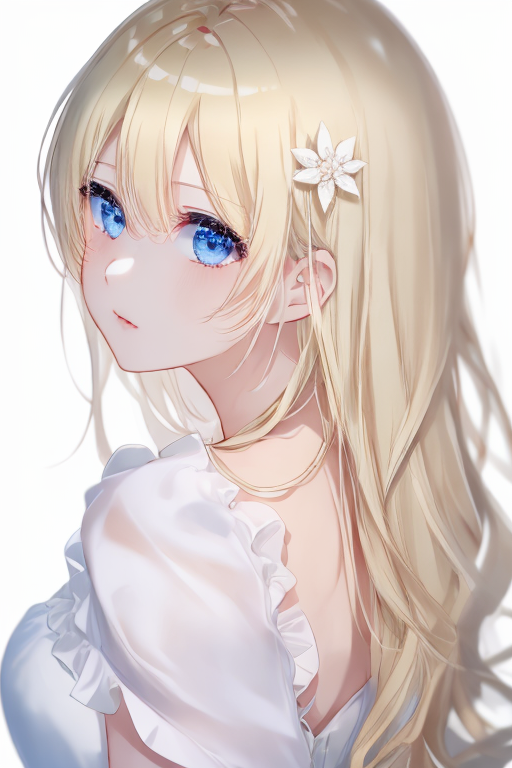 upper body,(beautiful detailed eyes),looking_back, blonde hair, masterpiece,best_quality,white background,masterpiece,white dress,<lora:Miwano-Rag-000012:1>