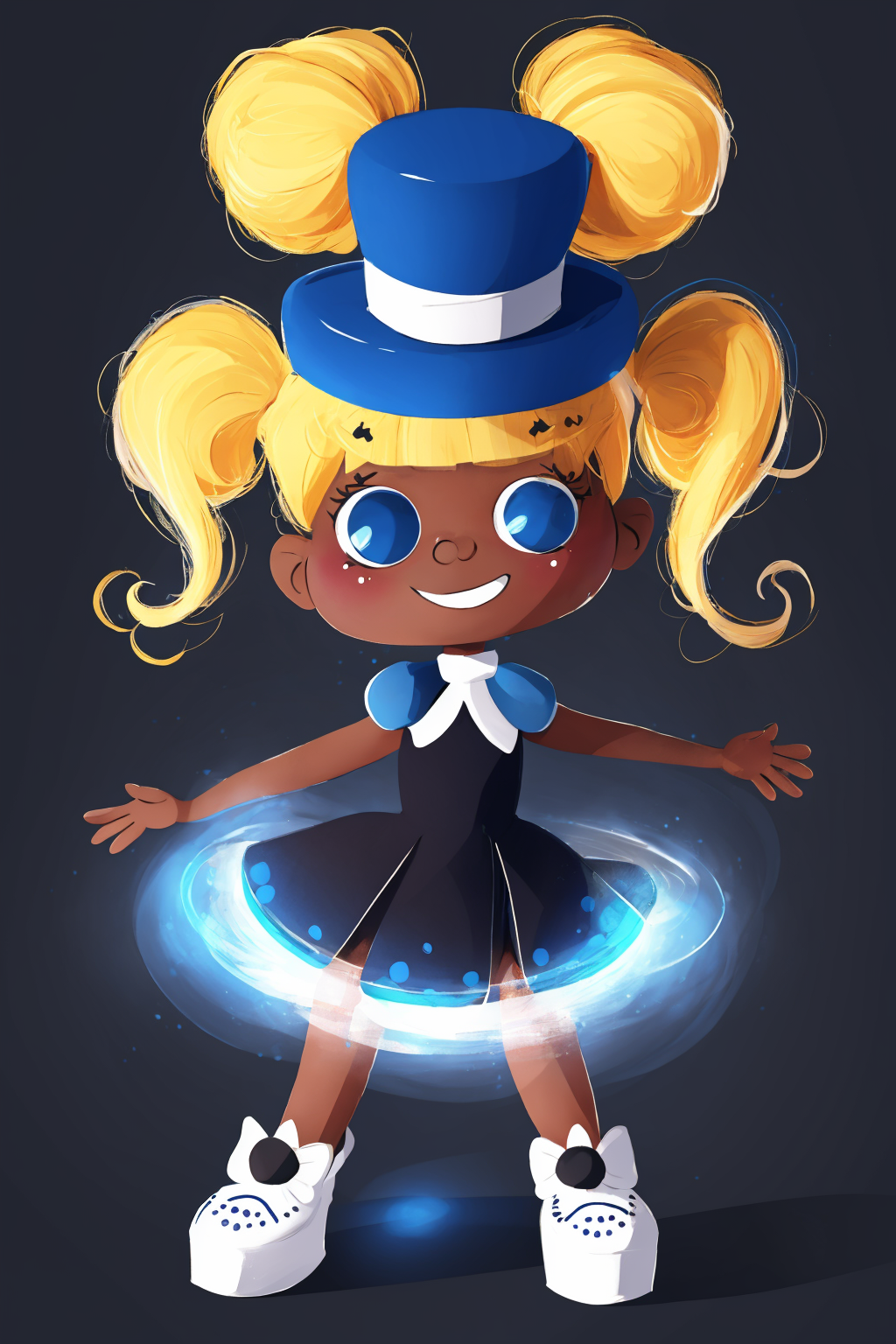 fant, antonella fant, 1girl, solo, smile, blue eyes, blonde hair, simple background, hair ornament, hat, white background, dress, twintails, full body, signature, dark skin, black footwear, dark-skinned female, blue dress, shadow, short twintails, top hat, octopus, <lora:antonellafant-04:0.95>