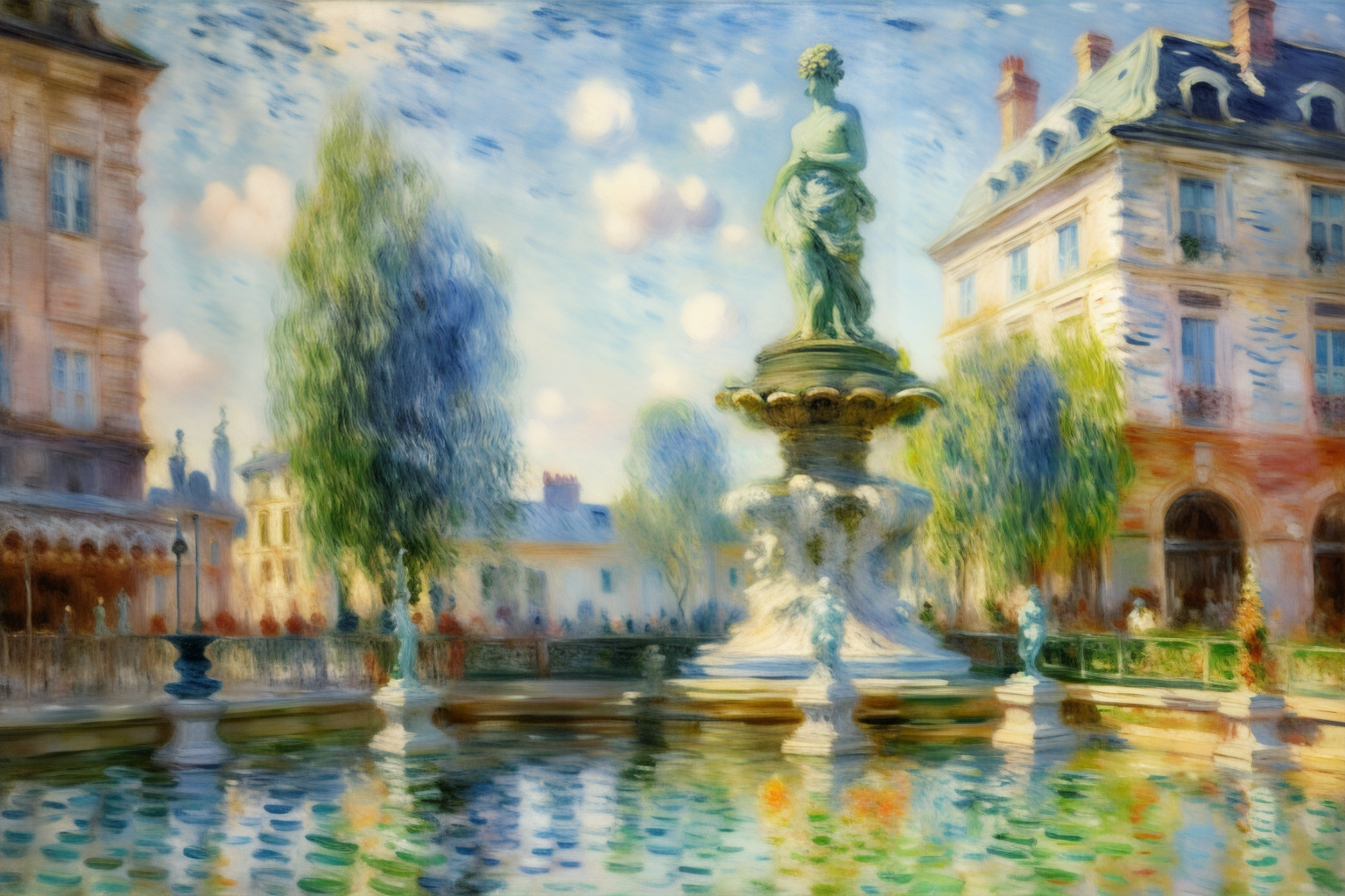 Claude_Monet, a paintng of marble statue in city square, fountain, morning, <lora:Claude_Monet:1>