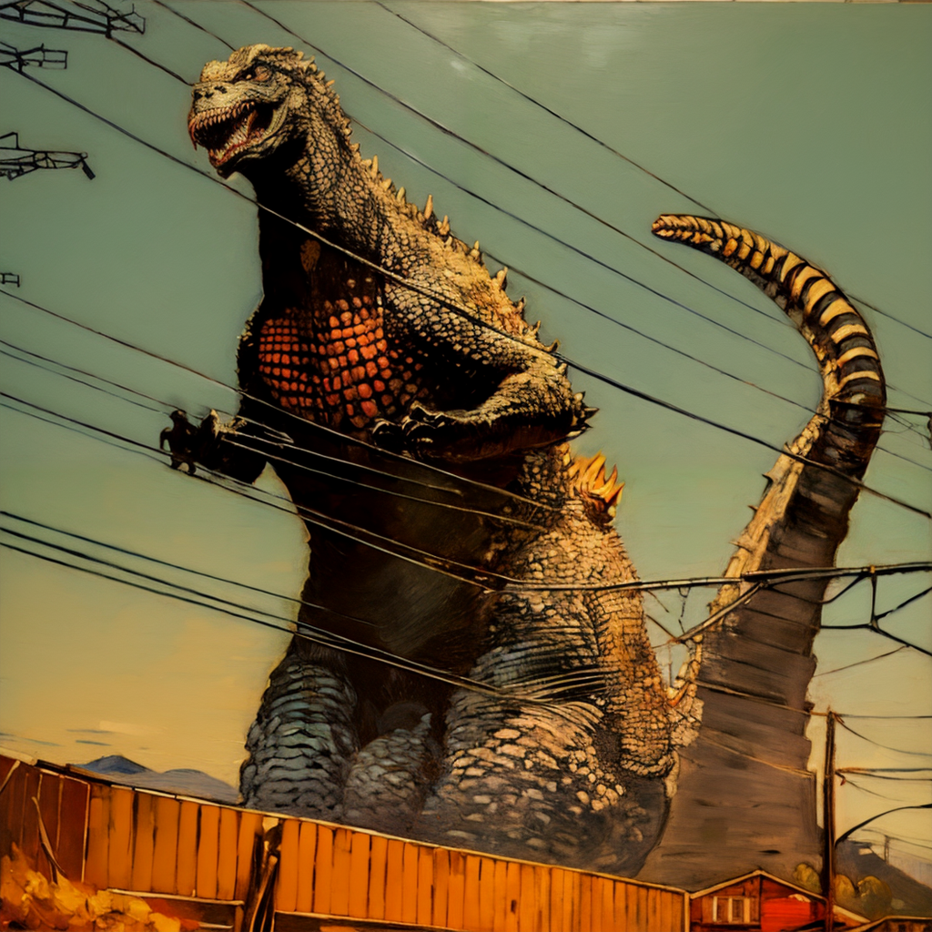 tom_thomson, a painting of Godzilla, long tail, powerlines, pole, <lora:Tom Thomson:1>
