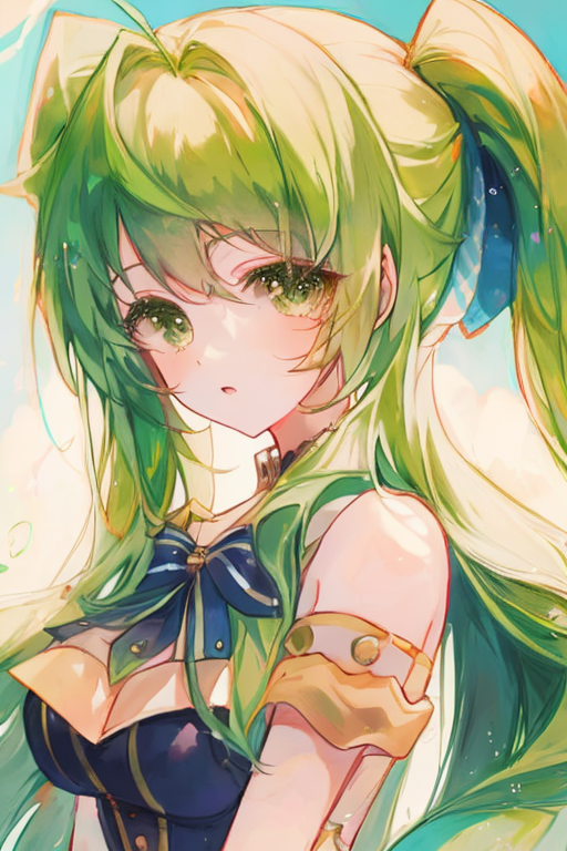 pastel \(medium\),1girl, twintails,green hair,green eyes,looking at viewer, <lora:matcha-000010:1>