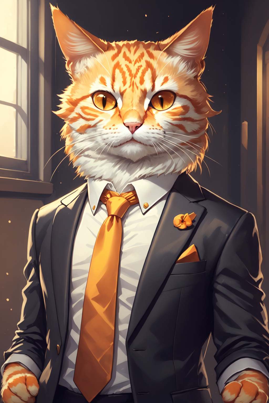 <lora:cat-000008:0.8> orange c4ttitude, wearing black suit