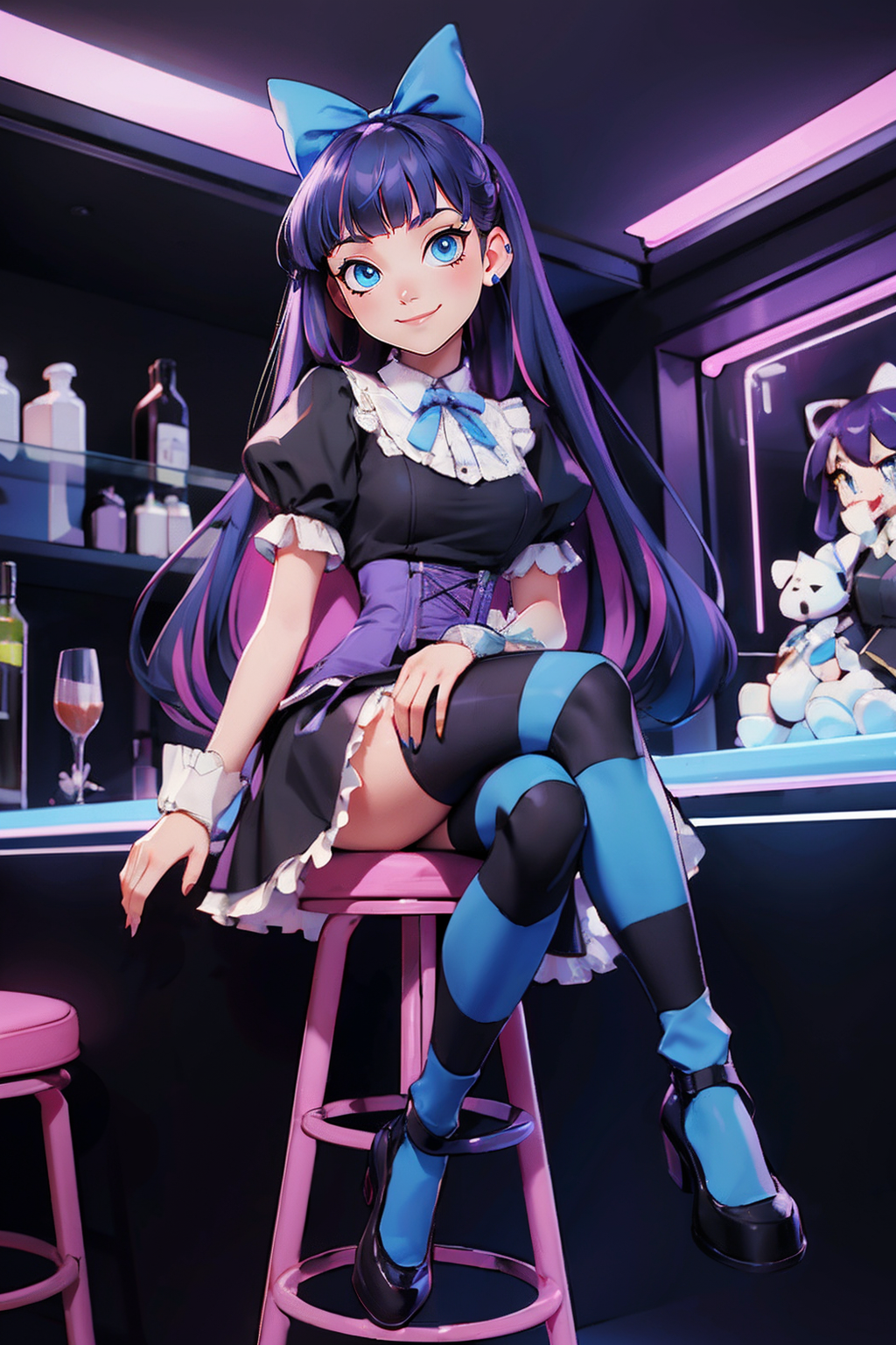 stocking, blue eyes, multicolored hair, purple hair, black dress, stripped legwear, looking at viewer,seductive smile, sitting, on stool, legs crossed, inside night club, counter, neon lighting, high quality, masterpiece, <lora:StockingAnarchy_Mix:.8>
