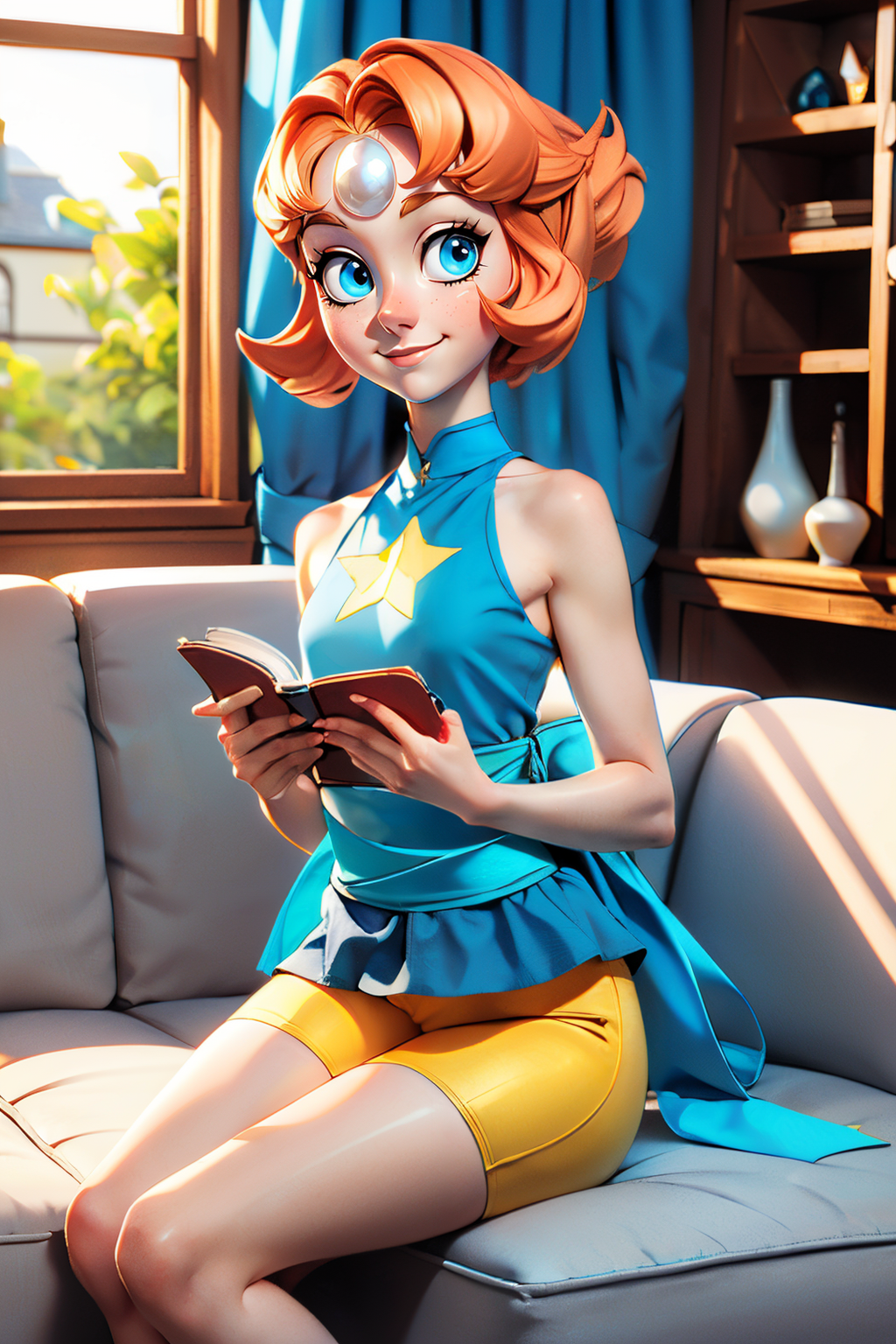 pearl, orange hair, pointy nose, forehead jewel, blue eyes,blue dress, bare shoulders, tiny gold star(shape), blue sash,small blue skirt, yellow bike shorts, looking at viewer, smiling, sitting, on sofa, holding a book, inside cozy living room, soft lighting, high quality, masterpiece, <lora:Pearl-10v6:.8>