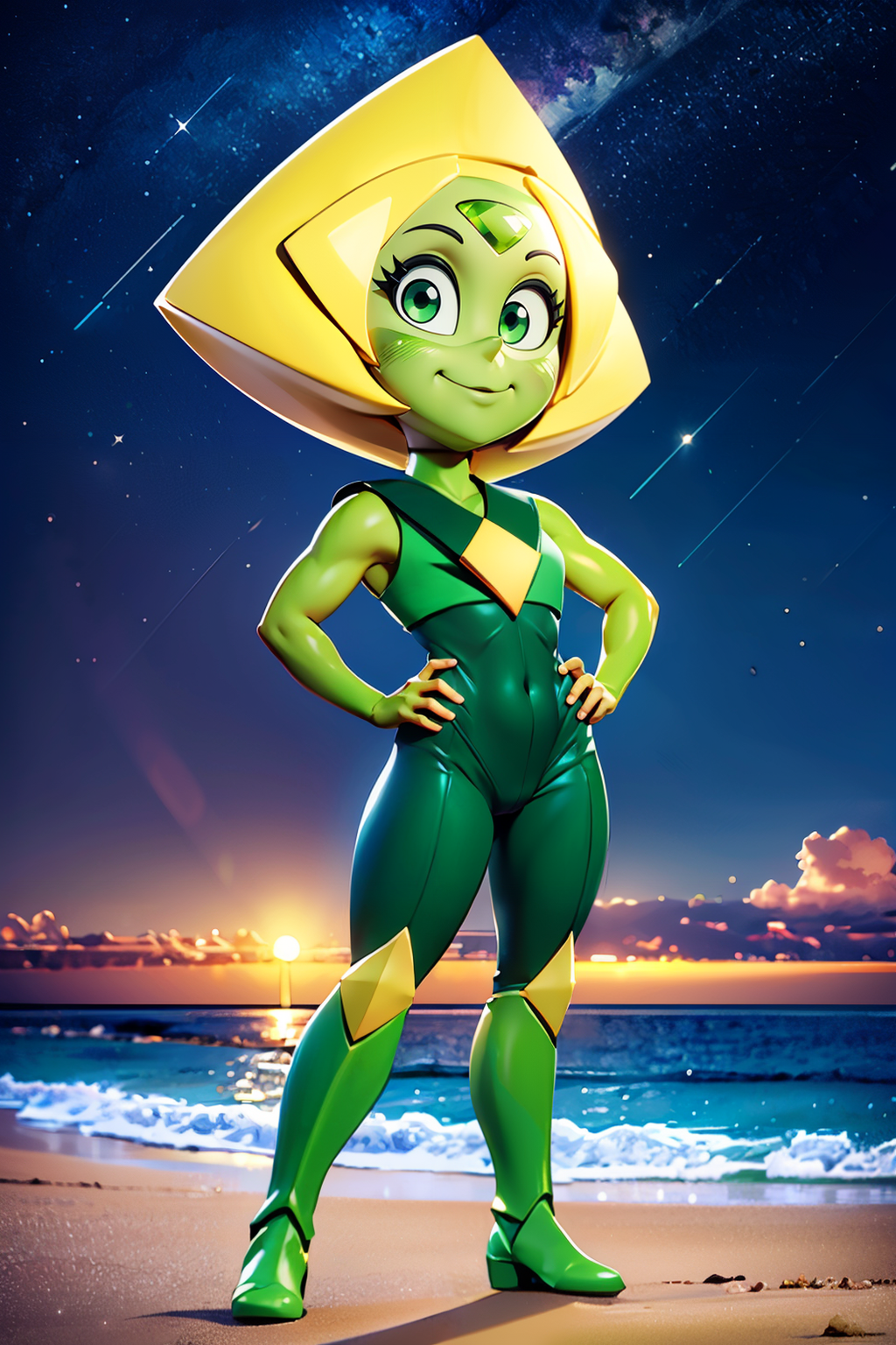 Peridot, green skin,green eyes,(yellow visor) blonde hair, bodysuit,sleeveless, diamond (shape) on chest, looking at viewer, smiling, full body shot, standing, outside, hand on hip, beach, ocean, night time, stars and space, high quality, masterpiece, <lora:Peridot:.7>