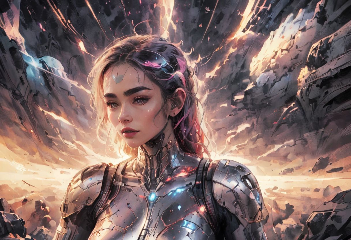 (masterpiece), (extremely intricate:1.3), (ultra realistic), professional photograph portrait of stunningly beautiful young woman, detailed, pale, full lips, (futuristic battle armor), (metal reflections), upper body, spaceship, intense sunlight, far away galaxy background, sharp focus, dramatic, cinematic lighting, octane render, unreal engine 6, bokeh, motion blur:1.3),