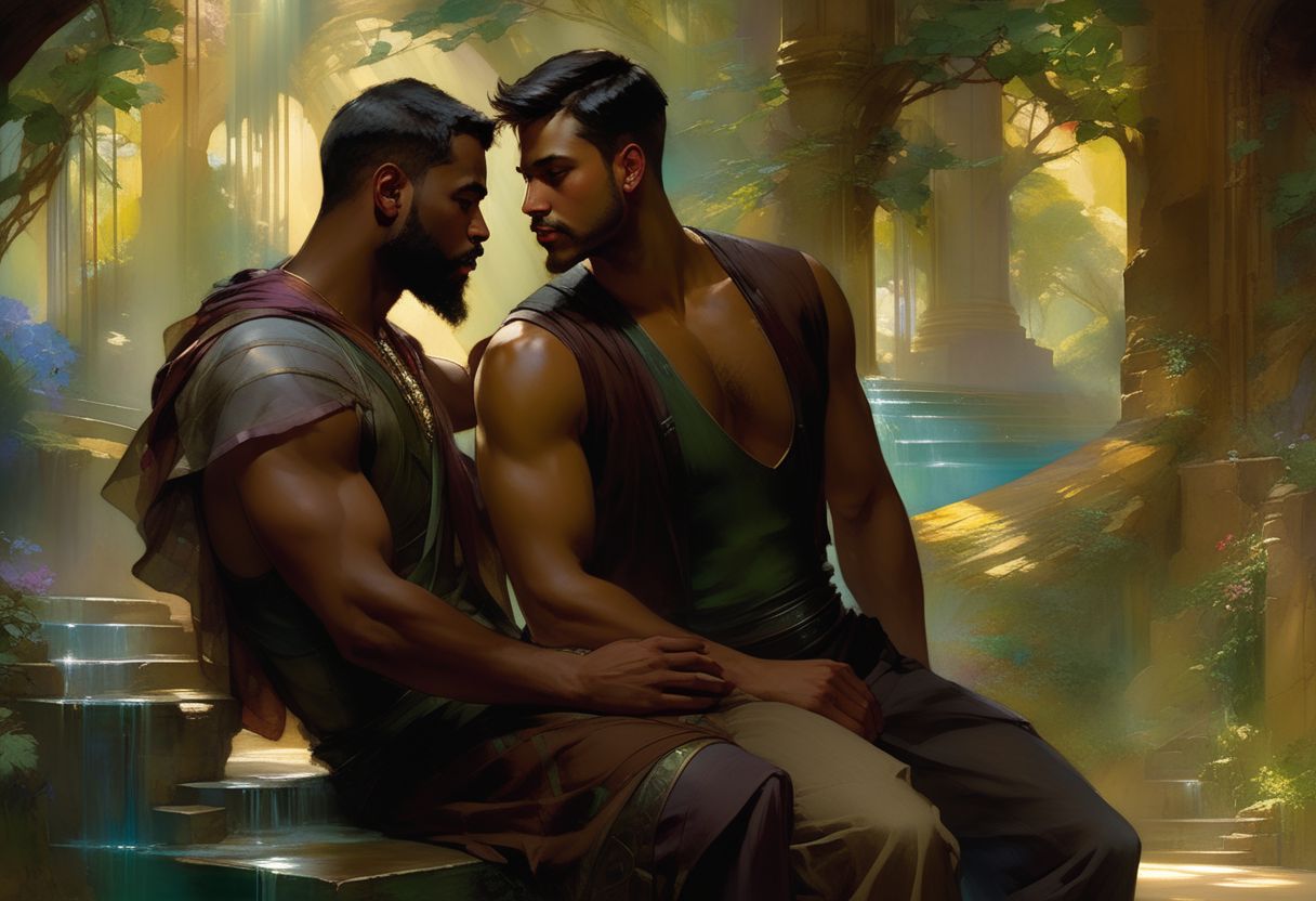 futuristic epic fantasy, science fiction, high-tech, dynamic, magical. a homoerotic, homoromantic, gay, loving, exciting, steamy, magnificent, sensual, visceral, amazing, sexy, intense, dramatic masterpiece (by Daniel F Gerhartz|Gaston Bussiere|Maximilian Pirner:1.9) of two men in love named R and M. M and R are both in their early 30s, extremely attractive, virile, powerful, masculine, hairy, strong, desirable, hunky, and manly. M and R are wearing futuristic clothing resembling Robin Hood. R is a short, brown-skinned, muscular, iraqi man, with very short hair, and a perfect beard. He is shorter than M. M is a tall, dark-tan-skinned, athletic, mexican protector, with very short hair, and a short beard. He is taller than R. The setting is indoors. the time is late at night. a warm, gentle, tender, loving, comforting embrace. The overall mood is provocative, passionate, expressive, sensual, magical, and visceral, evocative of gay romance, gravitas, and love. extremely detailed, romantic lighting, romantic mood, romantic atmospheric, shadowplay, vignette.