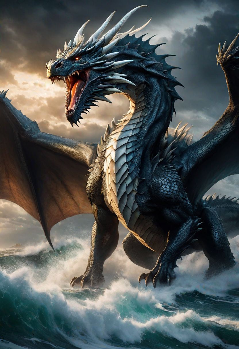 A riveting cinematic scene of a majestic white-coated dragon, roaring fiercely while protecting its eggs. The dragon's eyes glisten with determination, and its wings are spread wide, ready to take flight. The stormy sea, with massive waves crashing around, creates a dramatic and atmospheric setting. The night sky is filled with dark clouds, and the overall ambiance is intense and epic.