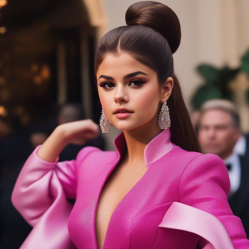 Portrait of Selena Gomez (ohwx woman) <lora:SelenaGomez-000007:1> as Barbie, pink barbie doll, barbie doll, barbie goddess, barbie queen, bimbo queen, pink makeup, queen, empress, pink ball gown, elegant ball gown, expensive ball gown, jewels, expensive jewels, hair bun, large hair bun, oversized hair bun, hair extension hair bun, slutty hair bun, slutty hair, elegant, expensive, rich bitch, slutty, silk, boss, powerful, empowerment, successful, extravagant