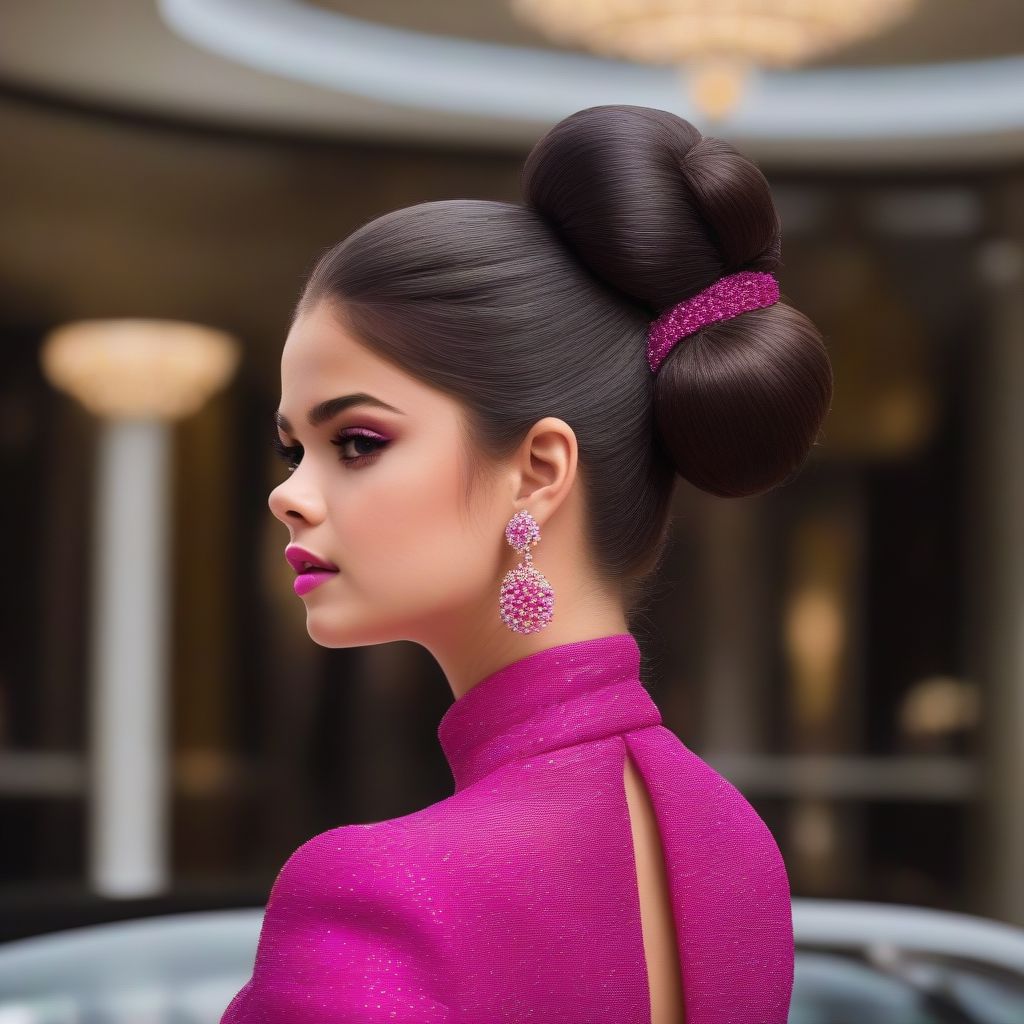 Portrait of Selena Gomez (ohwx woman) <lora:SelenaGomez-000007:1> as Barbie, pink barbie doll, barbie doll, barbie goddess, barbie queen, bimbo queen, pink makeup, queen, empress, pink ball gown, elegant ball gown, expensive ball gown, jewels, expensive jewels, hair bun, large hair bun, oversized hair bun, hair extension hair bun, slutty hair bun, slutty hair, elegant, expensive, rich bitch, slutty, silk, boss, powerful, empowerment, successful, extravagant