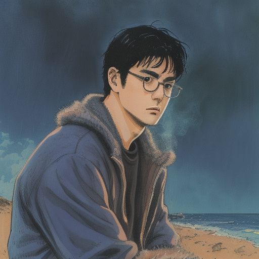 (((fuzzy colors))), anime style, Highly detailed illustration of a beautiful man black hair, wear glasses age 23 breakup, sitting inside beach, night time, rainy season, Studio Ghibli Film by Hayao Miyazaki, glowy magical smoke, pixiv, subtle colour, close mid-shot, (rule of thirds composition), best quality, gaze into the camera