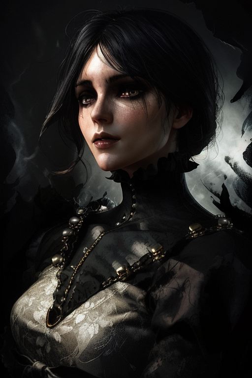 Oil painting, a forest free spirit Gothic girl, with delicate features, emerging from the depths of darkness, rendering a blend of mystery and allure. Her soft appearance contrasts against a background with rich deep dark hues. Captivating eyes and flowing ebony dark black hair. Masterfully combining realism and abstraction with figurative broad brush strokes and loose free brushwork. Layers of paint, streaks resembling movement. Shadow play and chiaroscuro adding depth and dimension to the Masterpiece. By Casey baugh, Jarek Kubicki, Anna Bocek Evocative, emotional, moody and subdued. Touches of painterly