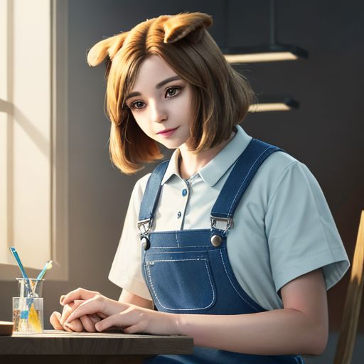 High quality, high resolution, masterpiece, bright light, low shadows, modern laboratory BREAK (1female dog:1.2), cute, dog girl, 25 years old, anthropomorphic, 4 fingers on each hand, wearing bib overalls BREAK 1human hand coming out of medical device on table BREAK Female dog holding hands with device