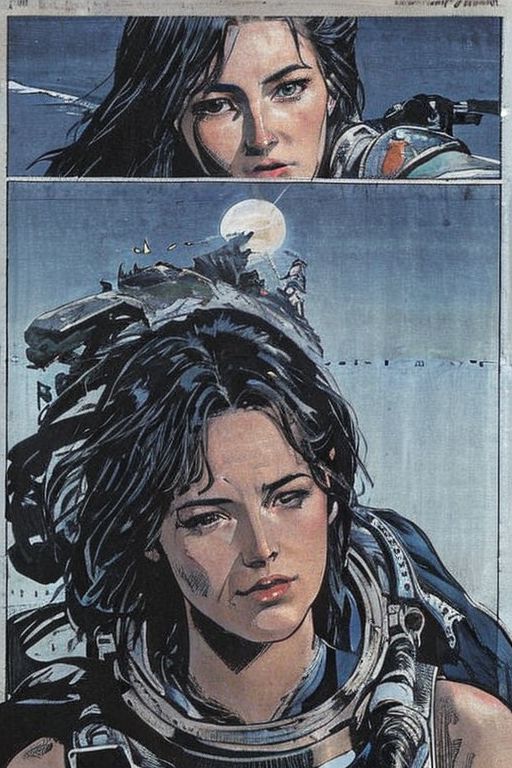 vintage-adult-comic, purple color Close-up face of a weathered beautiful female cowgirl astronaut face, etched with blue sun and grit. Eyes squint against the harsh blue sunlight, reflecting a glint of determination.wearing a bare shoulder sabrina against the backdrop of an empty town, reminiscent of the Wild planet. The blue sun casts a bluish aura glow on her face as she stands amidst the quiet planet of Eldorado, her expression a mix of resilience and contemplation. standard rectangles