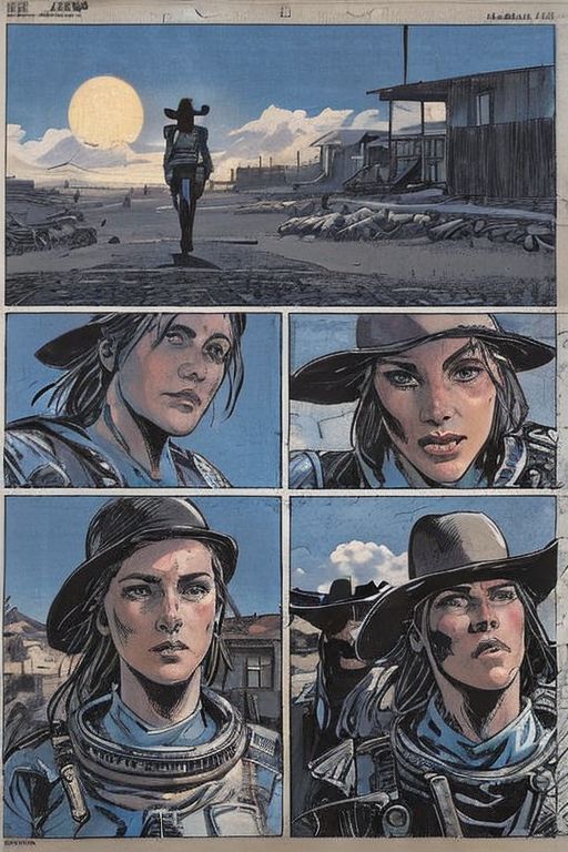 vintage-adult-comic, purple color Close-up face of a weathered beautiful female cowgirl astronaut face, etched with blue sun and grit. Eyes squint against the harsh blue sunlight, reflecting a glint of determination.wearing a bare shoulder sabrina against the backdrop of an empty town, reminiscent of the Wild West. The sun casts a warm glow on her face as she stands amidst the quiet streets of Eldorado, her expression a mix of resilience and contemplation. standard rectangles