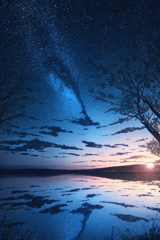 no humans, star (sky), scenery, sky, starry sky, night, tree, night sky, reflection, outdoors, blue theme, water, lake, nature <lora:JW-000005:1>