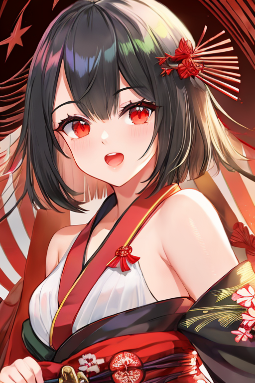 1girl,upper body,open mouth,black hair,red eyes,japanese clothes,kimono,upper body,rainbow, <lora:ATDAN_v2-000011:1>