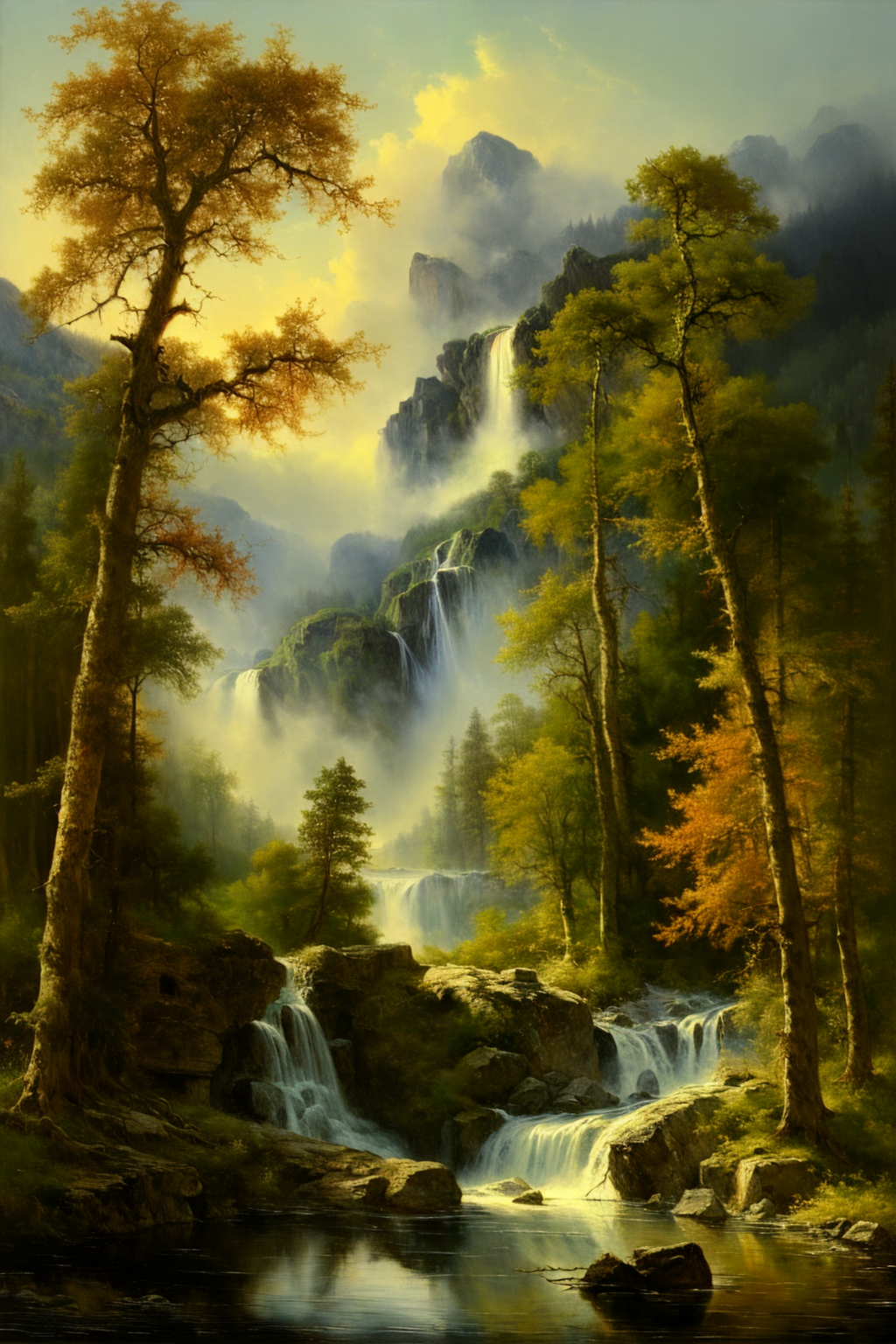 albert_bierstadt, a painting of a cabin in a forest beside a river with a waterfall, landscape, <lora:Albert_Bierstadt:1>