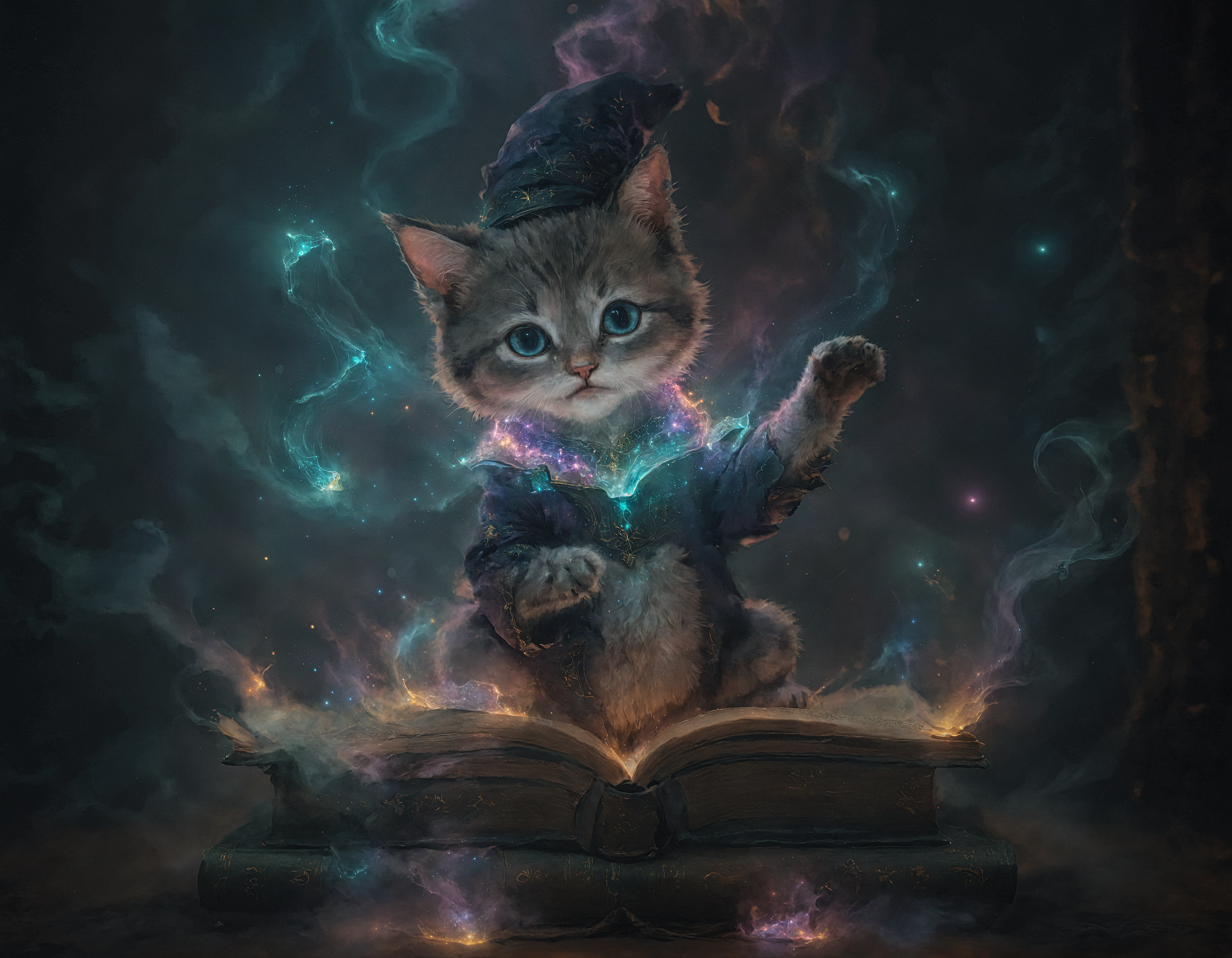 A cute baby wizard kitten dancing on a magical book, glowneon <lora:xl_more_art-full_v1:0.5>, <lora:add-detail-xl:1.0>, <lora:WowifierXL-V2.safetensors:0.5:0.5> <lora:EnvyAwesomizeXL01.safetensors:0.5:0.5> <lora:aestheticXL.safetensors:0.5:0.5> <lora:aesthetic_anime_v1sXL.safetensors:0.8:0.8> <lora:AnalogRedmondV2-Analog-AnalogRedmAF.safetensors:0.2:0.2> <lora:sd_xl_dpo_lora_v1.safetensors:0.2:0.2> <lora:glowneon_xl_v1.safetensors:0.5:0.5> <lora:remixXL.safetensors:0.2:0.2> <lora:SDXLFaeTastic2400.safetensors:0.3:0.3> <lora:extremely_detailedXL.safetensors:0.5:0.5> <lora:polyhedron_all_sdxl-000004.safetensors:0.25:0.25>