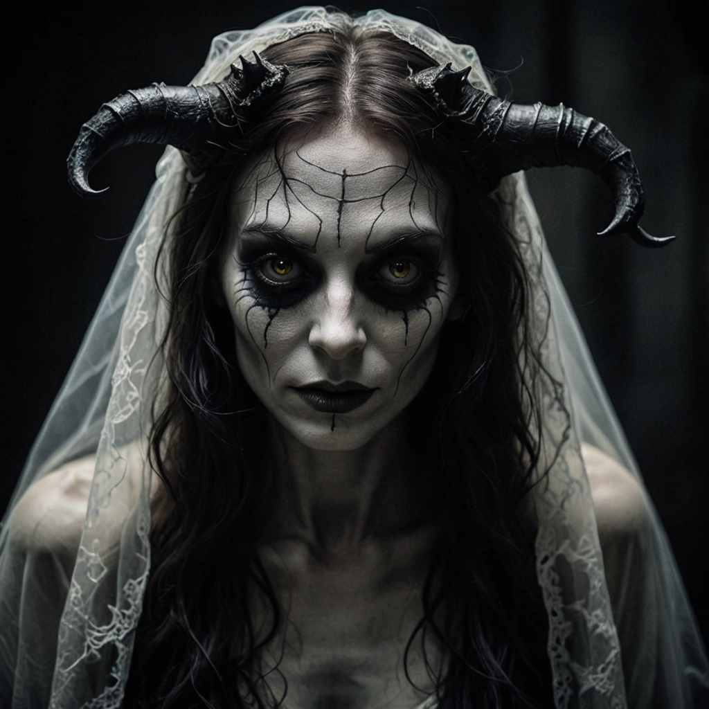 RAW photography, hauntingly beautiful demon, morbid and dark, eyes convey thought and fear, hint of calm and curiosity, ethereal void background, light and shadow interplay, eerie tranquility, beauty intertwined with macabre, intrigue and unease <lora:add-detail-xl:1>