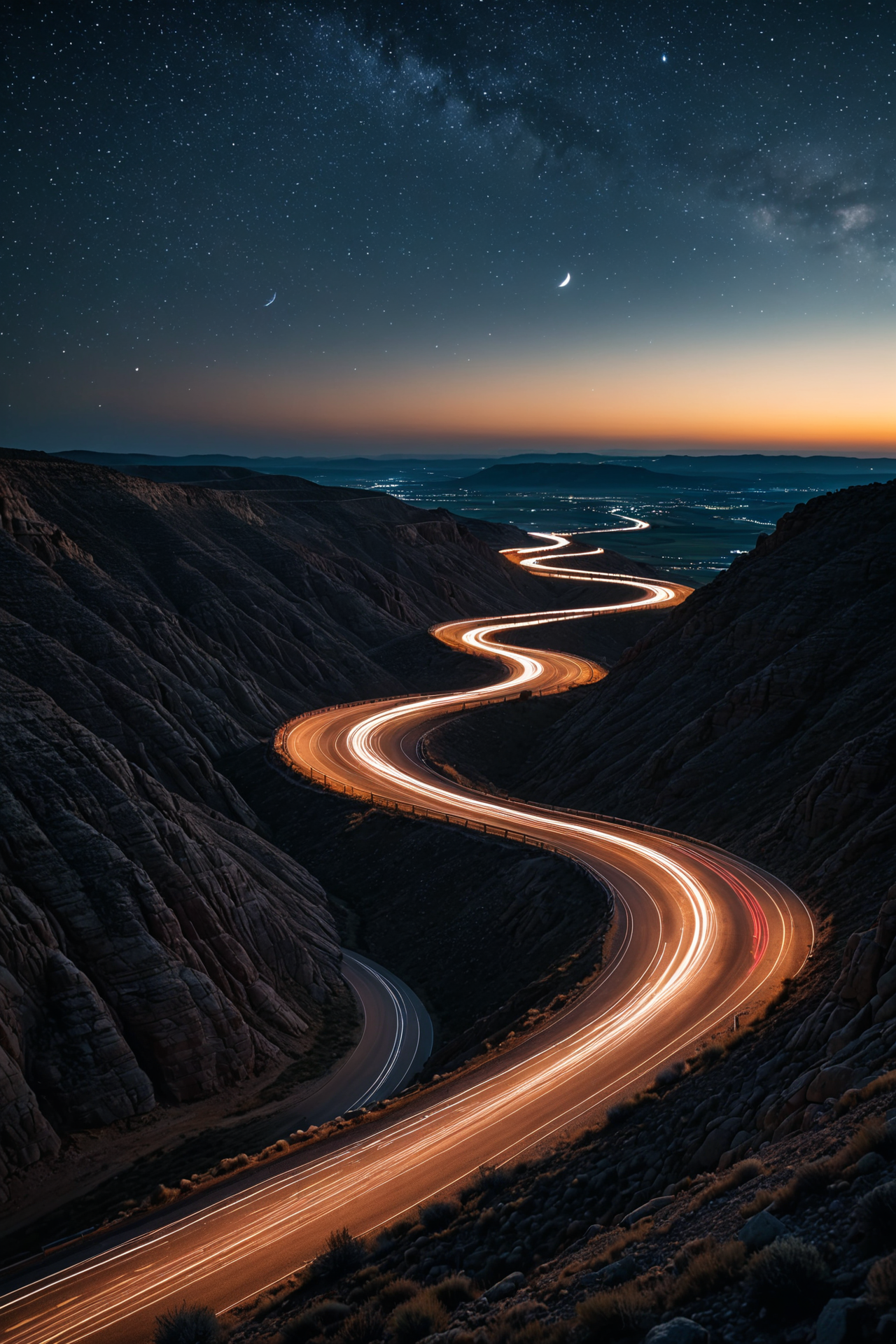 hyperrealistic,4k,landscape photography,vast vistas,a never ending spiral winding road at night,all in focus,starry sky,hairpin bend,hairpin corners,long exposure,(car taillights streaking:0.6),glorious landscape,great plains,captivating scenery,cinematic,masterpiece,Futurism art style,perfect composition,immersive,extreme details,serene atmospheric lighting,<lora:MJ52:0.5>,<lora:add-detail-xl:-1>,