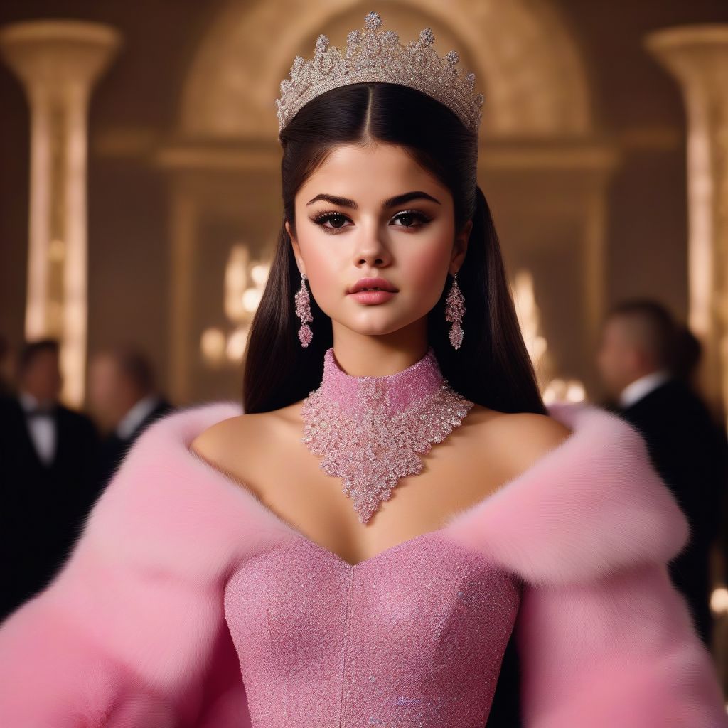 Portrait of Selena Gomez (ohwx woman) <lora:SelenaGomez-000007:1> as an elegant, expensive, rich bitch, pink Barbie queen, pink fur turtleneck jumper, jewels, slutty, slutty jewelry, long hair, hair extensions, elegant hair, fancy hair, boss bitch, boss, bossy, princess, goddess, empress, barbie princess, pink princess