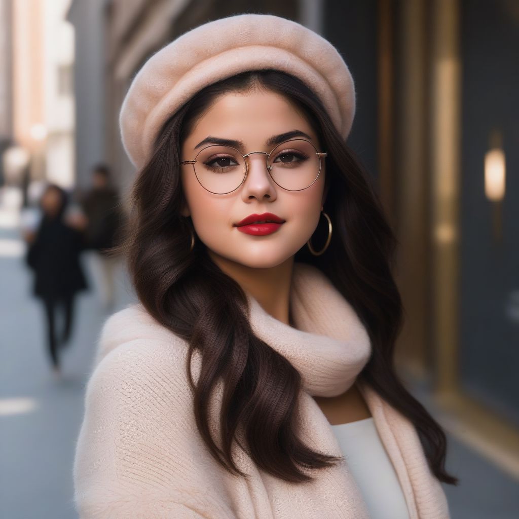 Portrait of Selena Gomez (ohwx woman) <lora:SelenaGomez-000007:1>, ((Masterpiece, best quality,edgQuality,photorealistic)),(smile:0.85) edgwdc, 1girl, solo,off shoulder sweater,scarf,glasses,lipstick,beret,shorts,pantyhose,wearing edgwdc<lora:edgWinterDressCode:0.8>, fur, fur scarf, fur beret hat