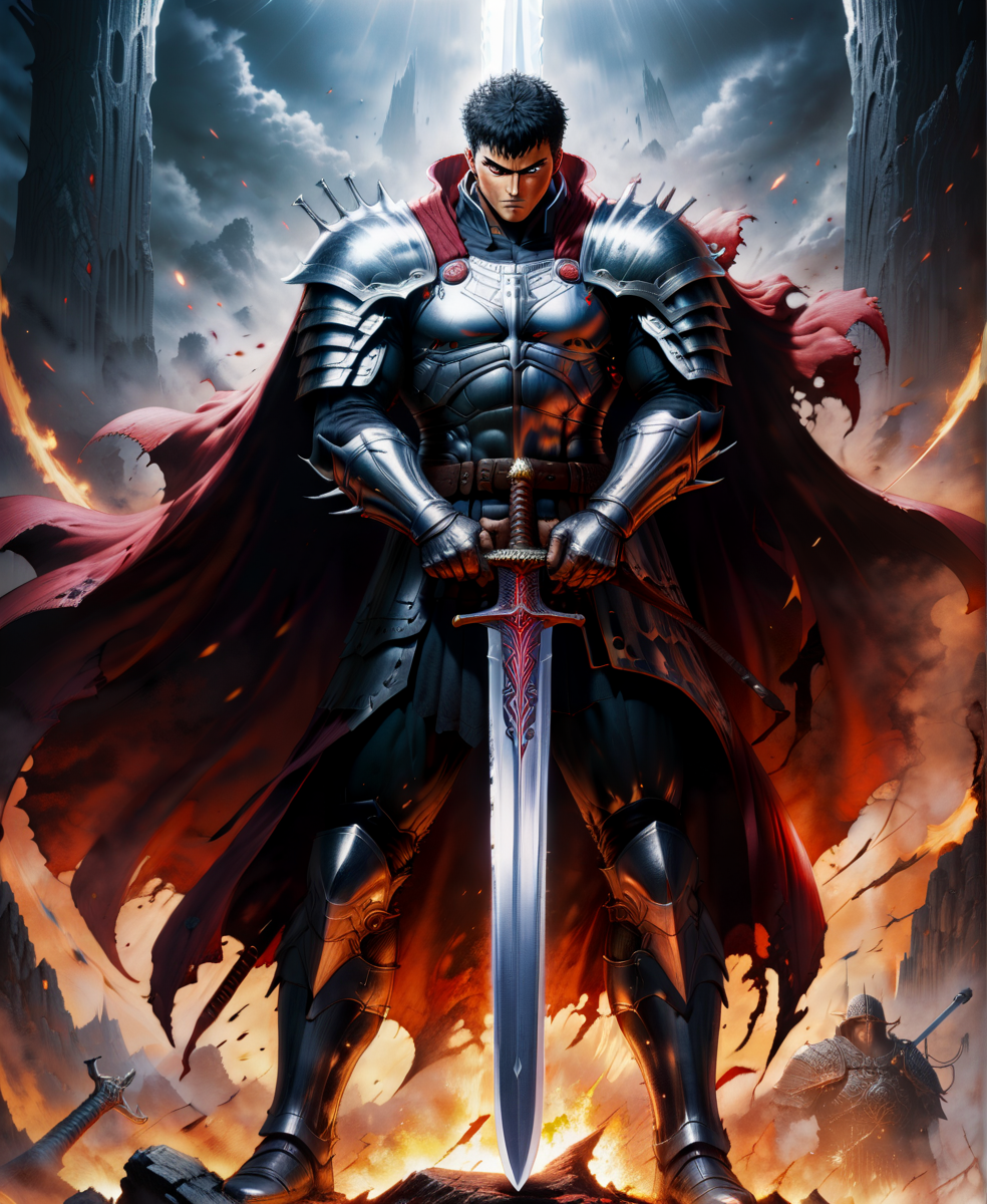 guts, berserk, holding giant sword, epic stance, mastrepiece, close-up , detailed , magnified , by David Maitland , Thomas Shahan , Nicky Bay , Levon Biss , Erez Marom <lora:add-detail-xl:1> <lora:xl_more_art-full_v1:1>