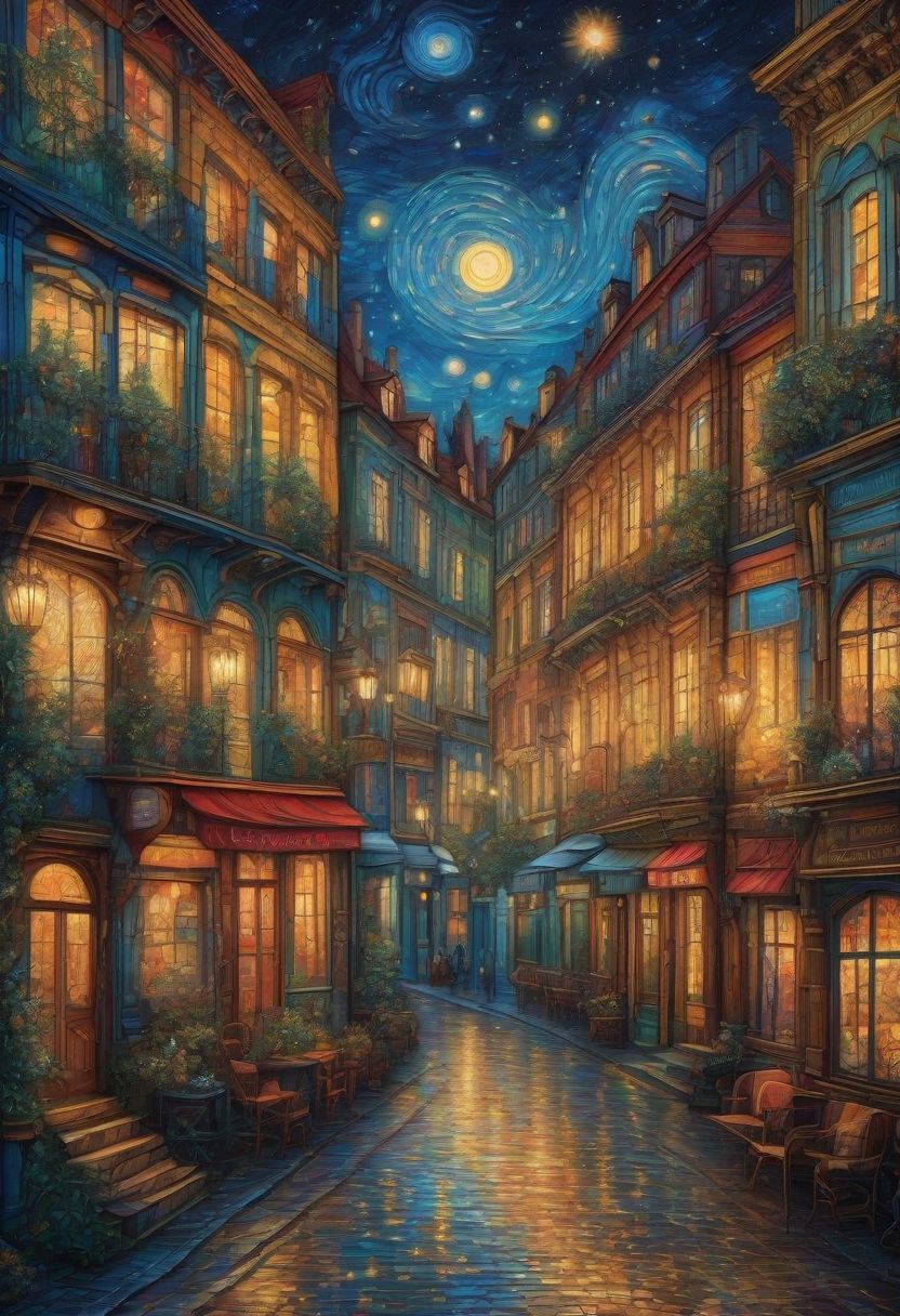 A mesmerizing masterpiece of fine art, painted in the style of Van Gogh, depicts a whimsical Parisian scene under a starry sky. The ultra-highly detailed illustration boasts vibrant colors and intricate, cinematic elements reminiscent of Dan Mumford and Andy Kehoe's works. The 2D, flat, and adorable characters interact in a mystical setting, with patchwork textures and stained glass patterns adding to the fairytale ambiance. The vintage, storybook-like atmosphere is enhanced by the luminism technique, showcasing the beauty of the complex background and tiny details that bring the scene to life., cinematic