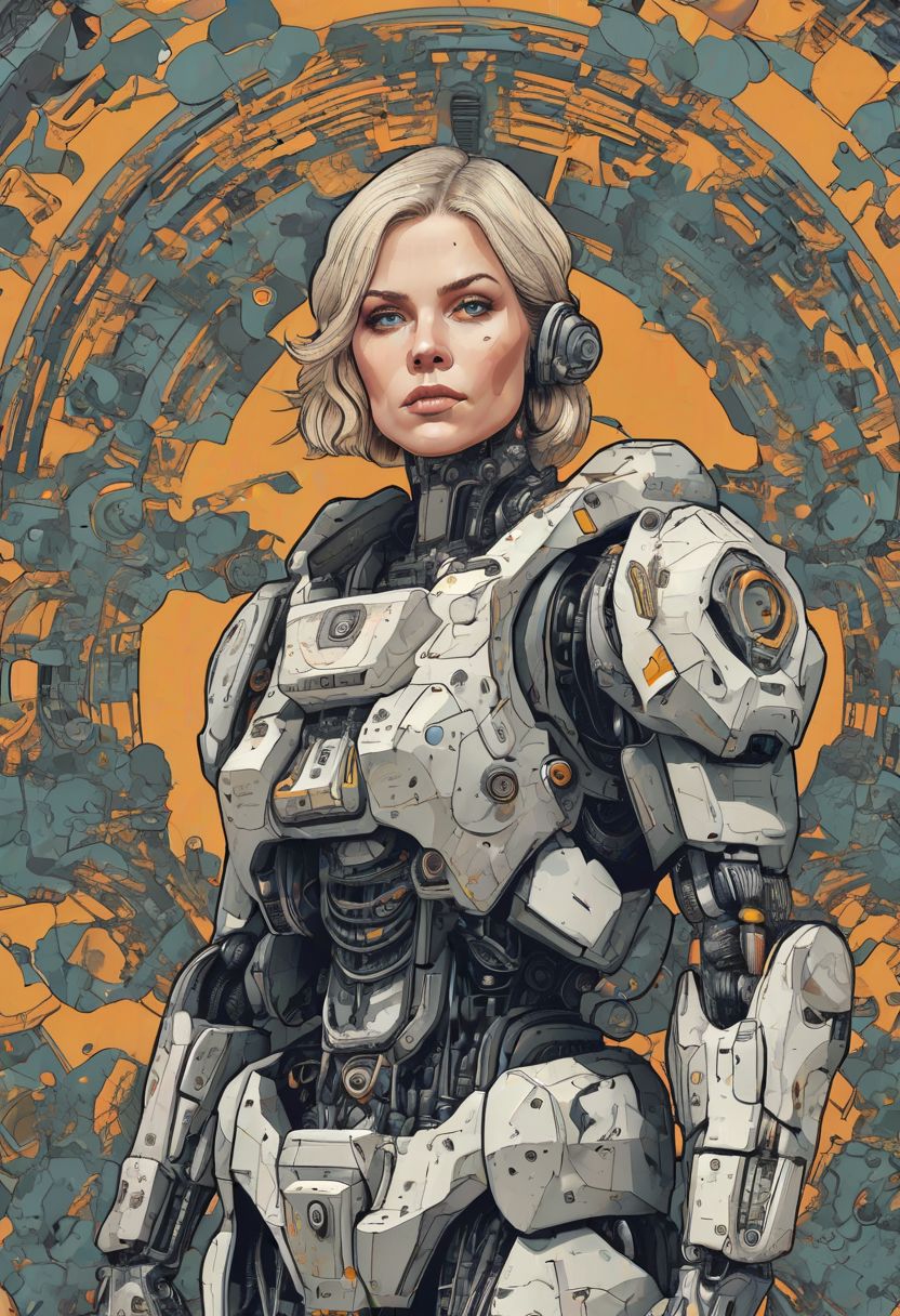 An illustration of a mature sci-fi soldier woman, full body shot, short blond hair, ultra detailed eyes, detailed face, hazel eyes, (oversized bulky mech armor:1.4), grey camo pattern, medium shot, Graphic novel style, (abstract psychedelic background:1.3)