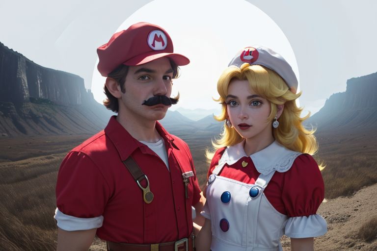 2People, Mario seen with Princess Peach! Mario is an Italian-American plumber with a thick handlebar mustach, Mario is wearing bright blue coveralls, a red shirt, and a red cap ((his red cap has a white circle on the front and in the white circle on the red cap is the letter "M". Princess Peach is a pretty, pale, long blonde haired princess wearing a two-toned pink, princess dress. Both people are seen individually, the first person, Mario (the Italian-American plumber with a thick handlebar mustach, Mario is wearing bright blue coveralls, a red shirt, and a red cap ((his red cap has a white circle on the front and in the white circle on the red cap is the letter "M"))) is seen with the second person, Princess Peach [the pretty, pale, long blonde haired princess wearing a two-toned pink, princess dress] in a scenic, dystopian, magical kingdom, dreamscape! : Breathtaking cinematic photo, frightening and dramatic photograph, terrifying Getty Images, disturbing fisheye view lit from the ground, experimental angles