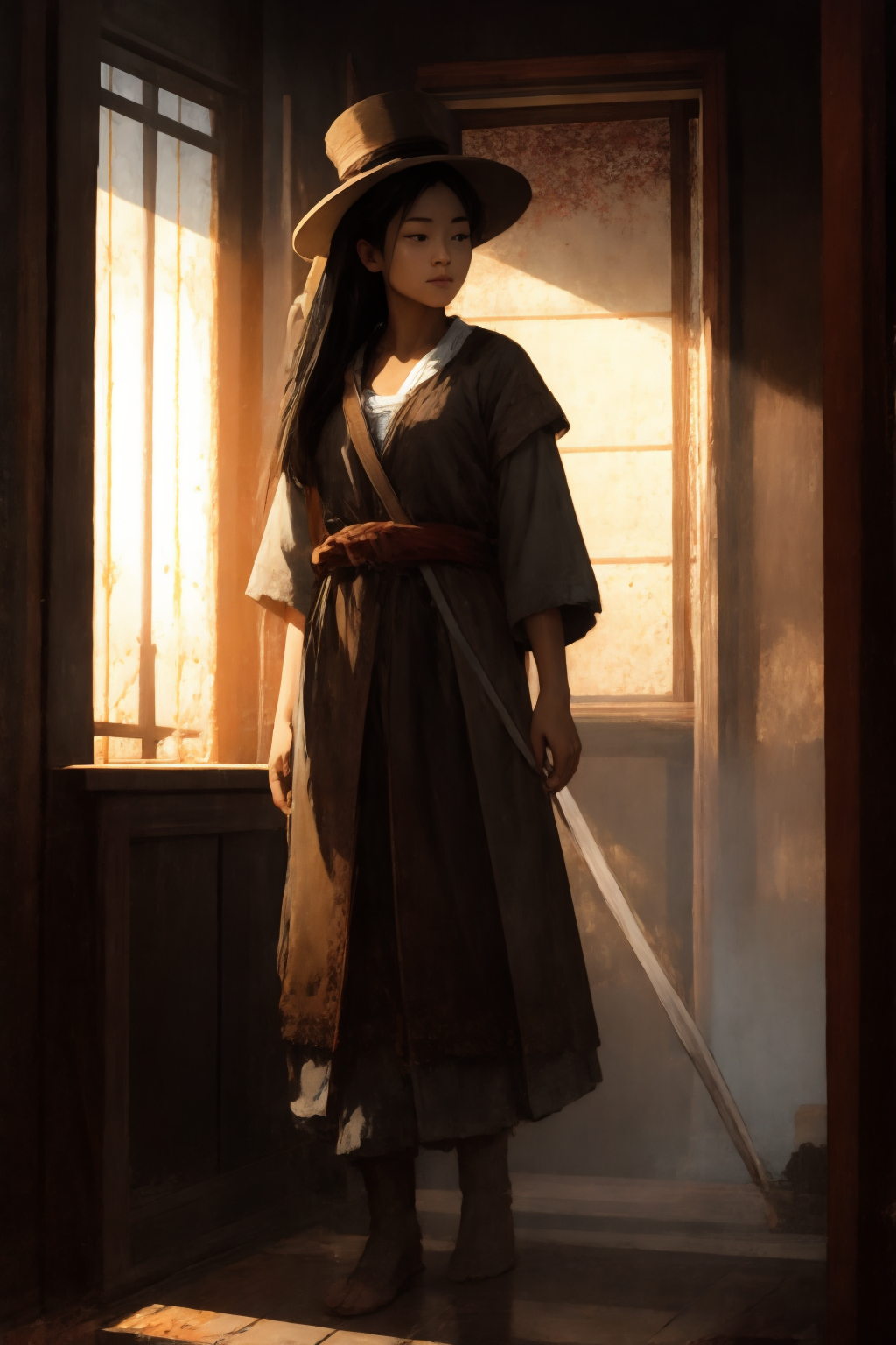 1girl, asian, (aestheticism, emotional depth, expressive brushwork, seductive expression), (ultra realistic 8k cg,perfect face, beautiful face, flawless, clean masterpiece, professional artwork, magnificent artwork), (long black hair, peasant:1.5, rags:1.5, conical hat:1.1), (full body, brooding), (standing, indoor:1.5), (chiaroscuro:1.5, obscured light and shadow, immersive atmosphere, ambient light:1.2, cinematic composition:1.3, HDR:0.1) <lora:painting:0.30>