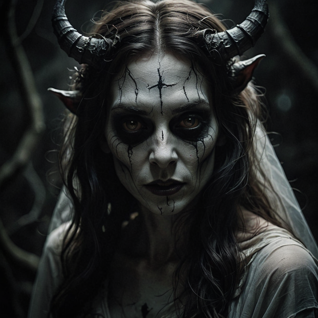 RAW photography, hauntingly beautiful demon, morbid and dark, eyes convey thought and fear, hint of calm and curiosity, ethereal void background, light and shadow interplay, eerie tranquility, beauty intertwined with macabre, intrigue and unease <lora:add-detail-xl:1>