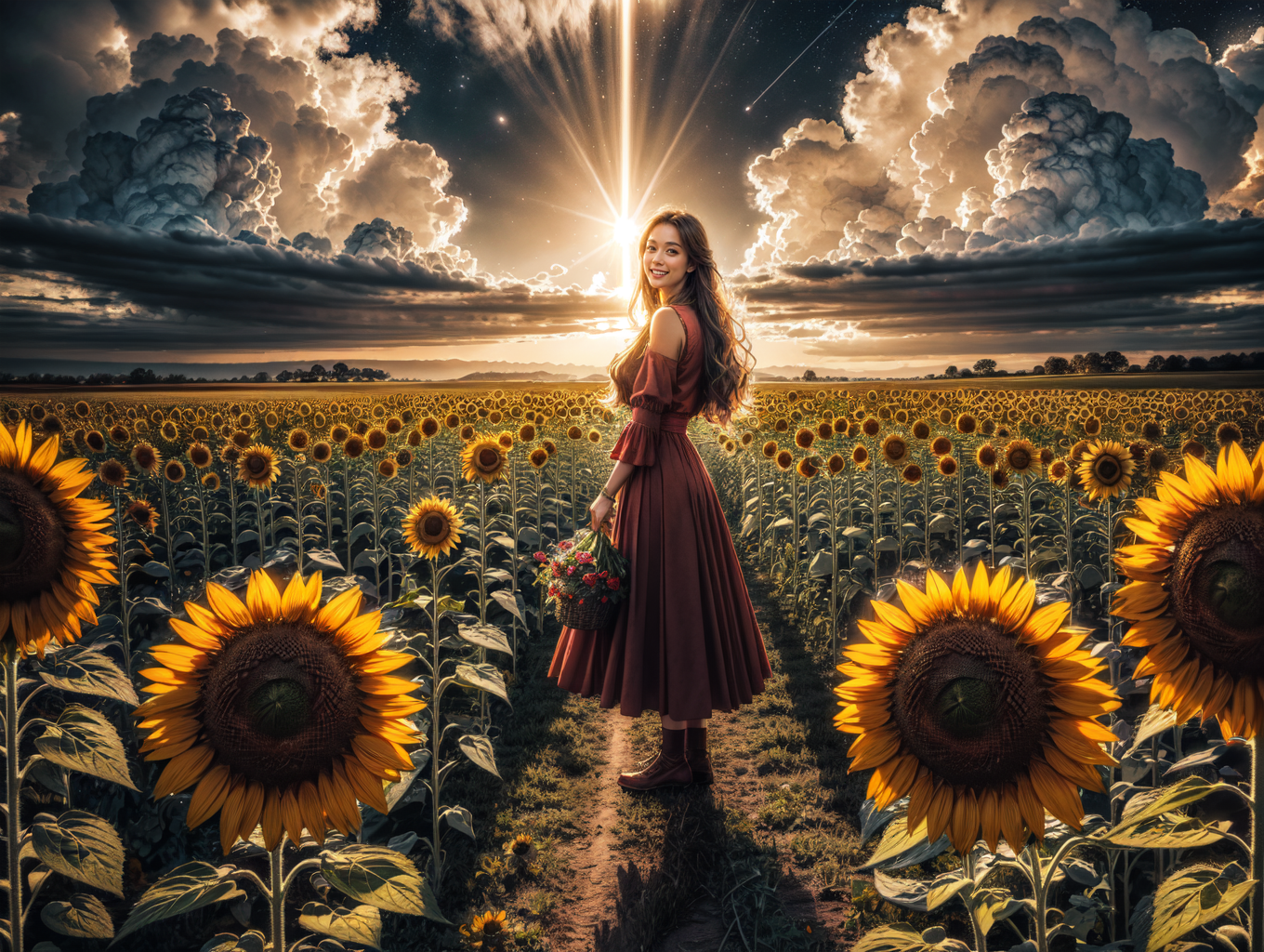 a woman holding a bunch of sunflowers in her hands and looking at the sky with a smile,((red clothes)),sunflowers field,(sky:1.3),clear sky,meadow,(giant flowers:1.5),strong wind,dramatic lighting,bloom, noisy film grain effect, super wide shot,(meteor:1.1),falling star,end of the world <lora:SLS:1>,dark theme <lora:LowRA:0.3>, official art,finely detail, Depth of field,(((masterpiece))),((extremely detailed CG unity 8k wallpaper)),best quality, high resolution illustration,Amazing,highres,intricate detail,(best illumination, best shadow, an extremely delicate and beautiful),, <lora:add_detail:1>, tilt-shift photography, miniature effect, selective focus, blurred edges, small-scale illusion, playful perspective,beautiful face