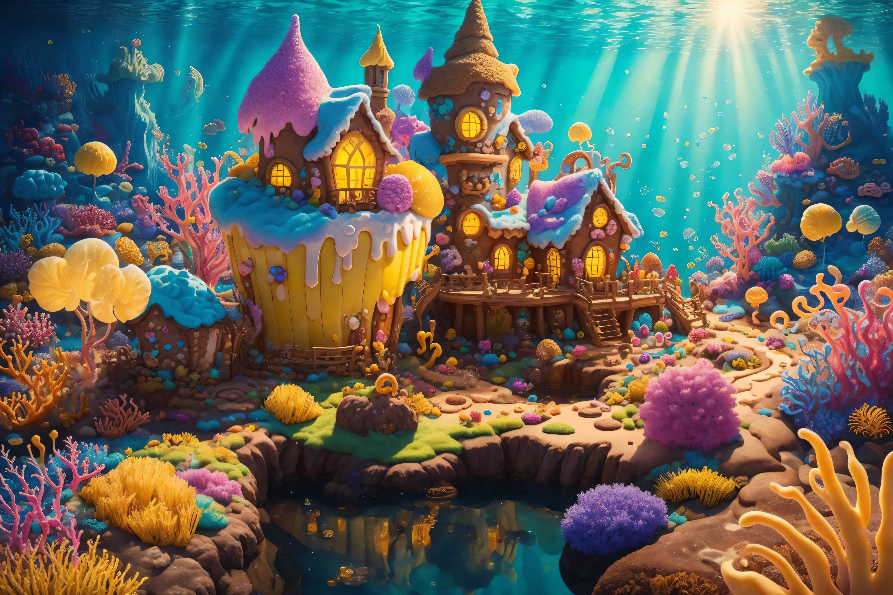 (Masterpiece, best quality:1.3), highly detailed, fantasy, <lora:Candyland-10:1>, 8k, candyland, dynamic, cinematic, ultra-detailed, full background, fantasy, illustration, drip, sparkle, pancake:1.3), (ocean), underwater, grass, syrup, glitter, scenery, ((no humans)), drizzle, beautiful, (shiny:1.2), various colors, monolithic, bloom:0.4, extremely detailed, (yellow and brown theme:1.3), striped, rainbow, (gradients)
