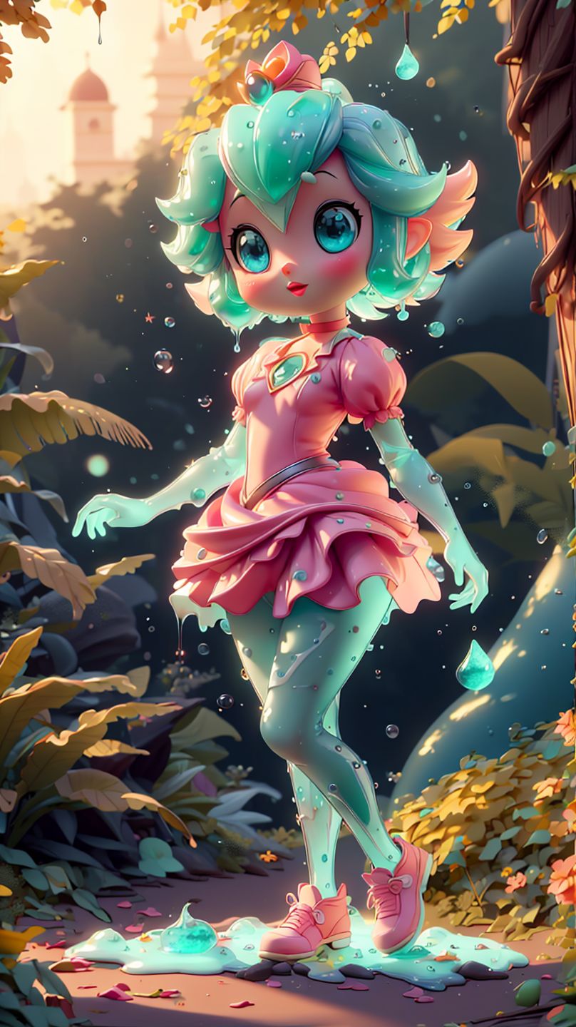(<lora:MintSlimeSkin3>),mintslimeskin,(luminescent translucent body:1.1),<lora:PrincessPeachMovie:0.6>,pink dress,1girl,female,princesspeach,(flat chest:1.21),(small breasts:1.21),narrow waist,skinny,groin,blue eyes,choker,detailed eyes,glossy lips,pink lips,light smile,masterpiece,perfect ligthing,bloom,cinematic lighting,day,outdoors,ocean,beach,highres,standing,looking at viewer,dynamic pose,solo focus,