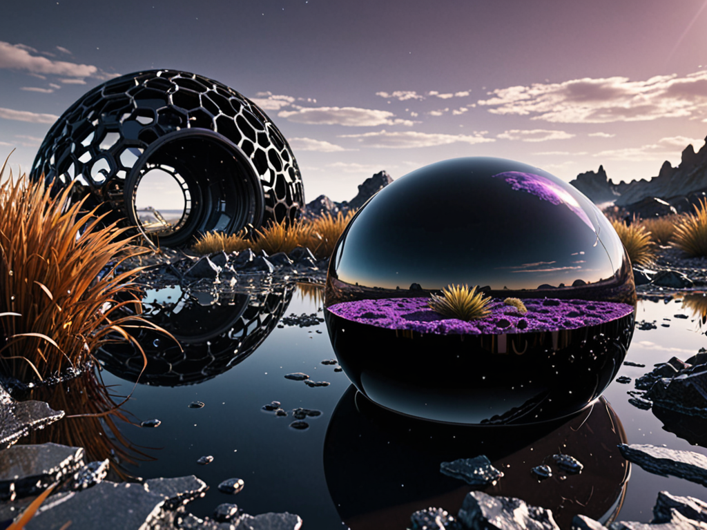 alien planet (abstract (black glass material) transparent ruins), intricate details, all ruins are of black glass material, ametrine crystals slightly growing from ground, ultra transparent shallow water covers slightly ground, multi-layered and multidimensional structure, grasses, strange sky, photorealistic, 8k, sharp focus, cinematic, ultradetailed