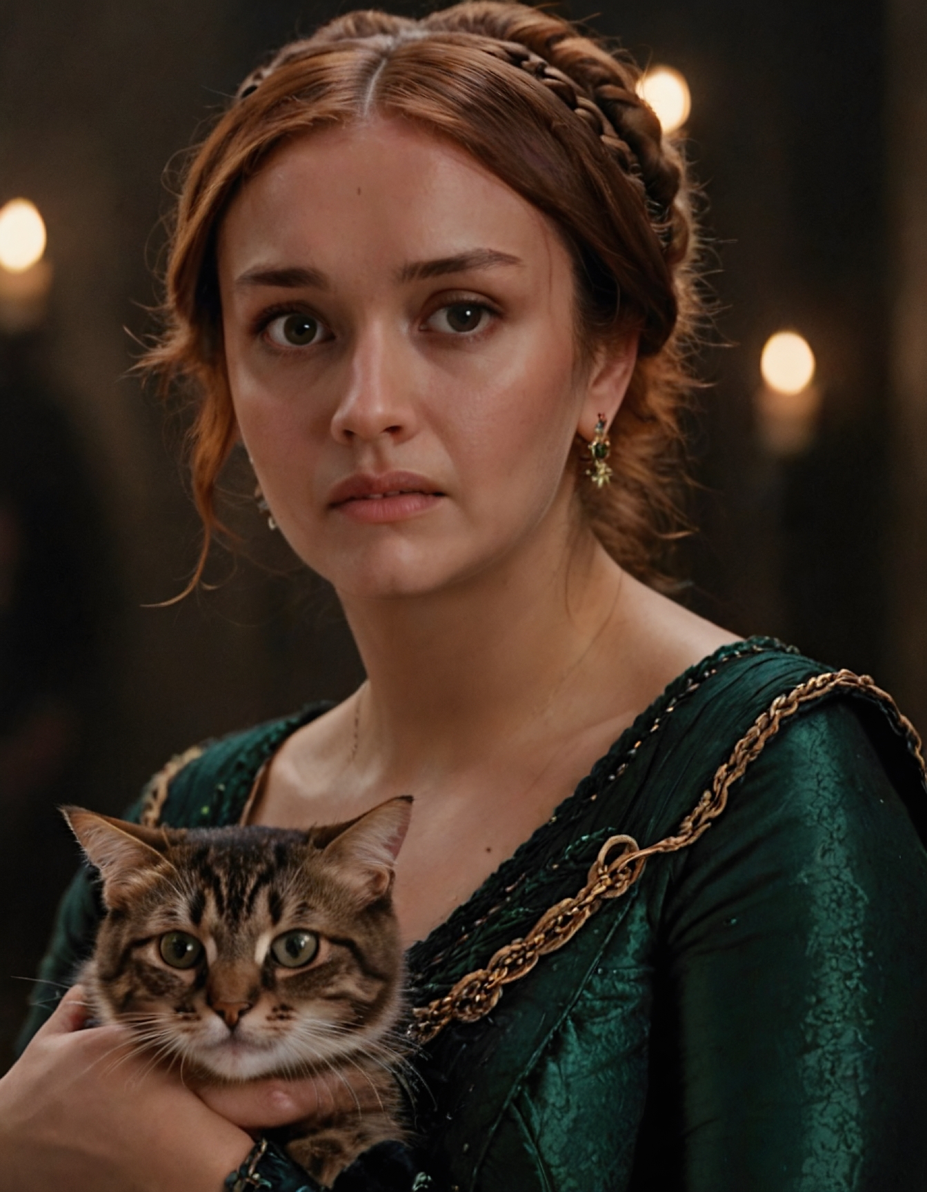 high resolution photo of alic3nt with brown hair and braided bun,close-up,wearing green outfit,volumetric lighting,the shot is cinematic,highly detailed skin,she is holding a cat