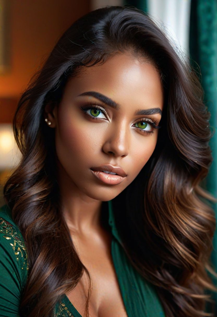 (far shot), realistic, photograph, (masterpiece), 8k quality, (detailed eyes:1.2), (highest quality:1.1), highly detailed, majestic, top quality, best quality, newest, ai-generated, (intricate details:1.1), extremely beautiful, elegant, majestic, immersive background+, (detailed face, perfect face), ((1girl), (dark skin), (long straight hair), (shining green eyes, very high resolution eyes, detailed round iris), detailed lips, detailed nose, detailed ears, hoops, mascara, (ornament on the forehead), soft muscular body, soft muscular arms, looking at viewer, far shot, dynamic posse, angled posse, a bedroom in complete disarray. Clothes are scattered on the floor, books are piled in the corners, and furniture drawers are open, revealing a chaos of personal belongings. In the midst of this disorder, there is a sense of life intensely lived
