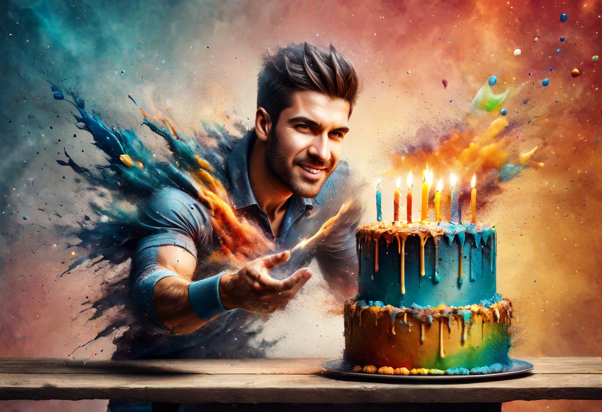 Male Minotor, celebrates their birthday, with a huge cake with candles ral-dissolve, fantastic colorful background