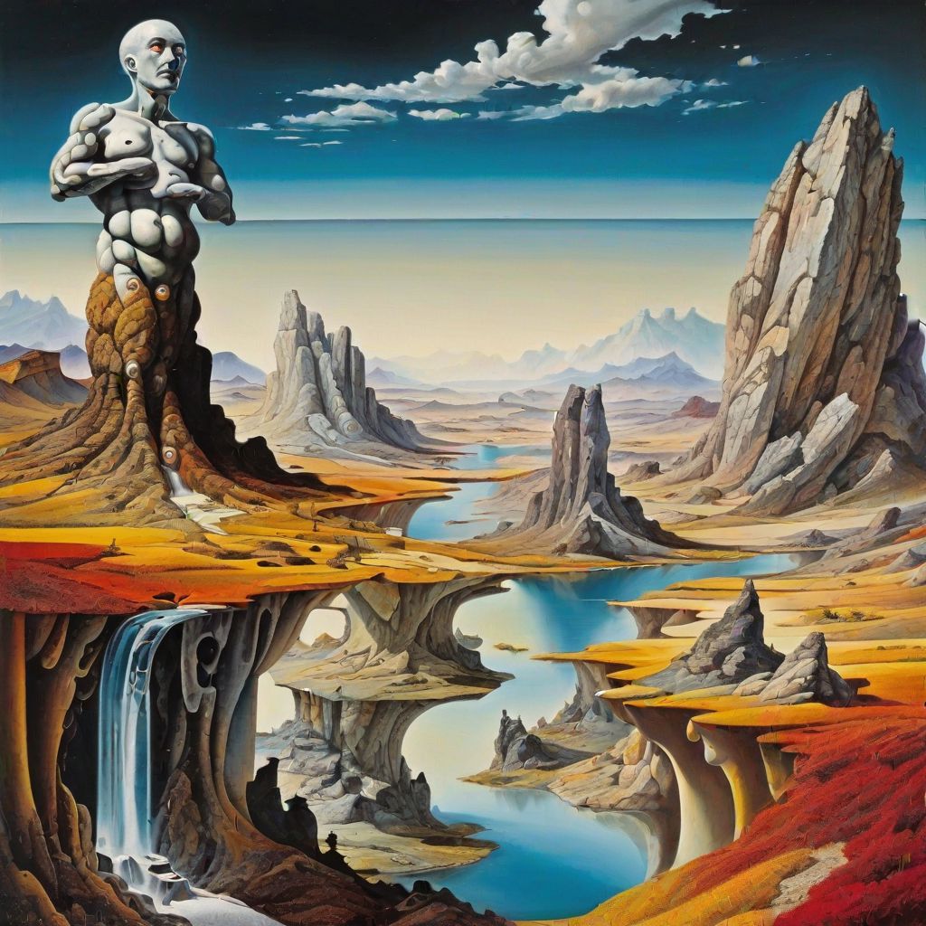 a hyper surrealistic landscape in the shape of giant male body, a mix of vibrant colors and black and white, surrealism, grandiose, masterpiece, sharp focus, very beautiful, amazing, whimsical landscape, art by (Salvador Dali, jacek yerka, egon schiele), bright colors, high contrast